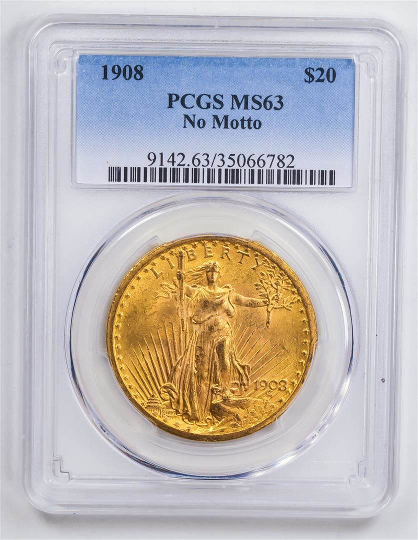 One 1908 $20 No Motto Double Eagle Gold Coin PCGS MS63.