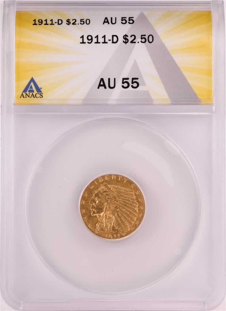 One 1911-D $2.5 Indian Head Quarter Eagle Gold Coin ANACS AU55.