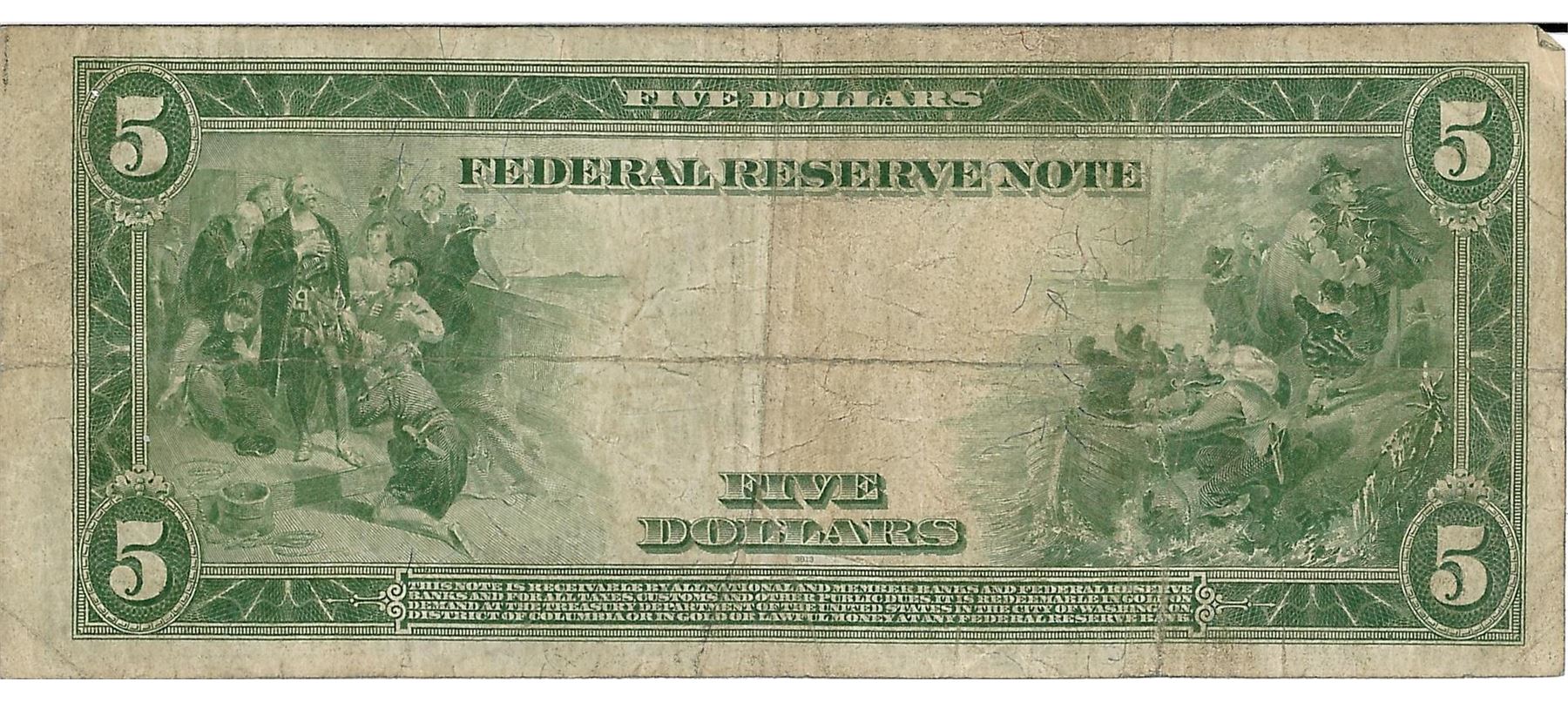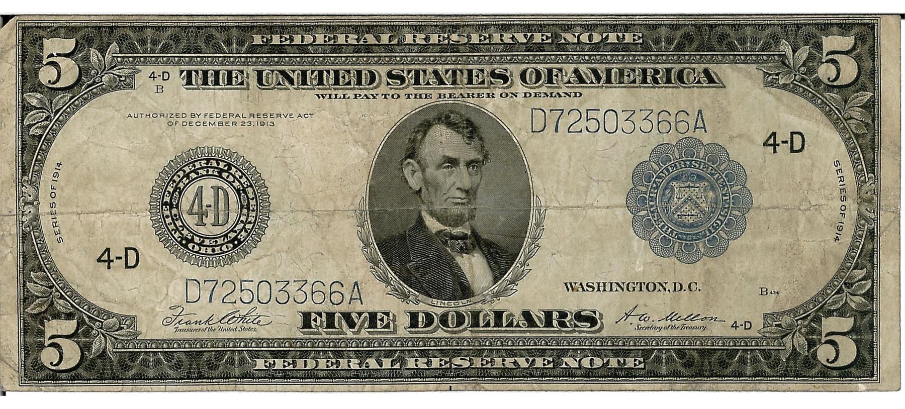 One 1914 $5 Federal Reserve Bank Note. The serial number is 72503366.
