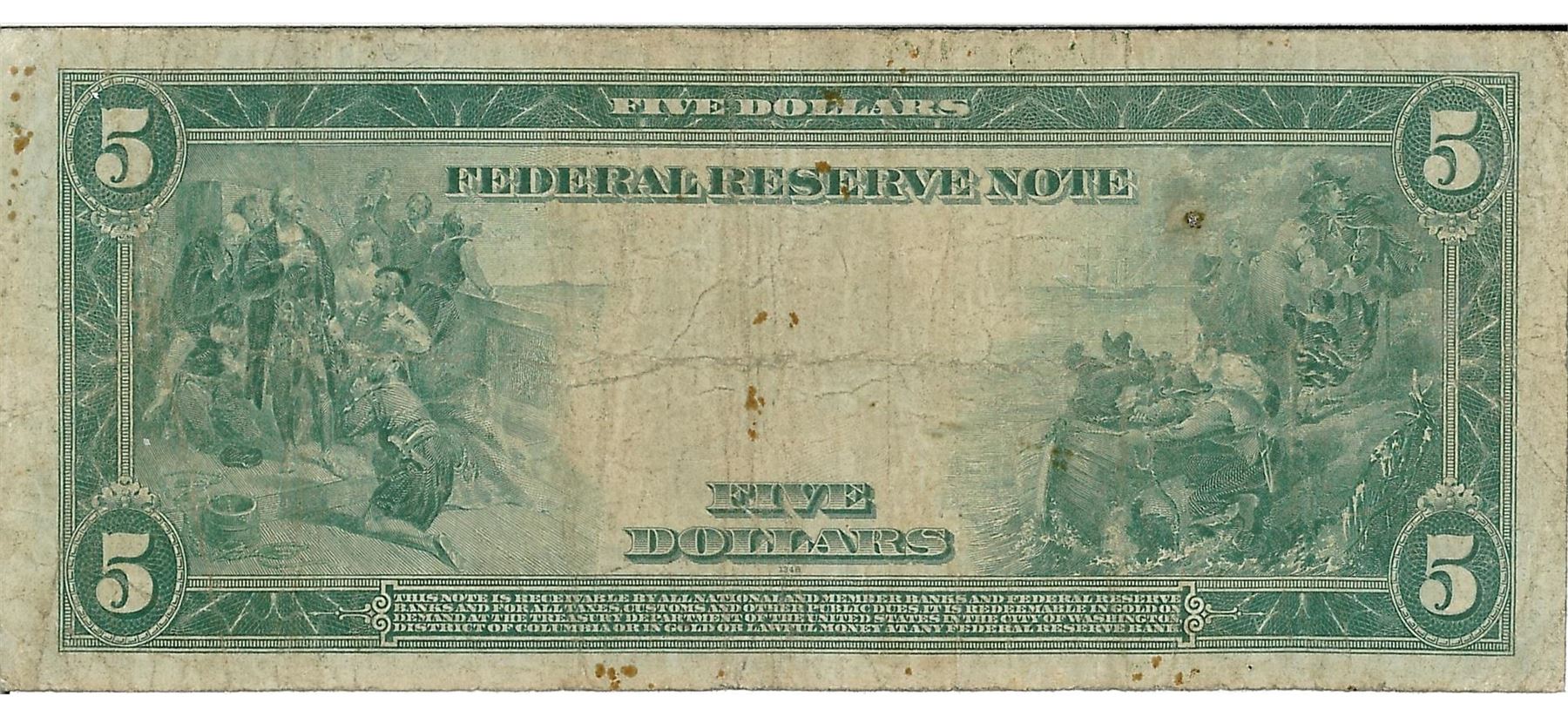 One 1914 $5 Federal Reserve Bank Note. The serial number is 22405261.