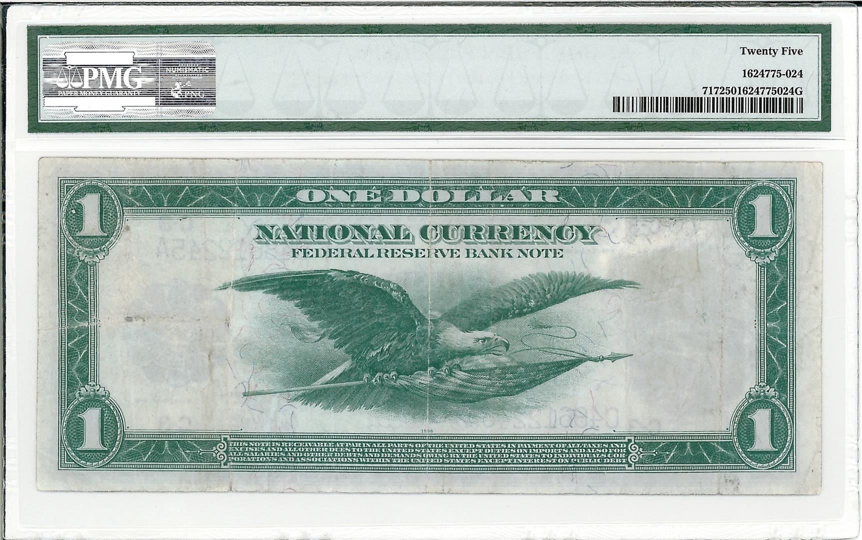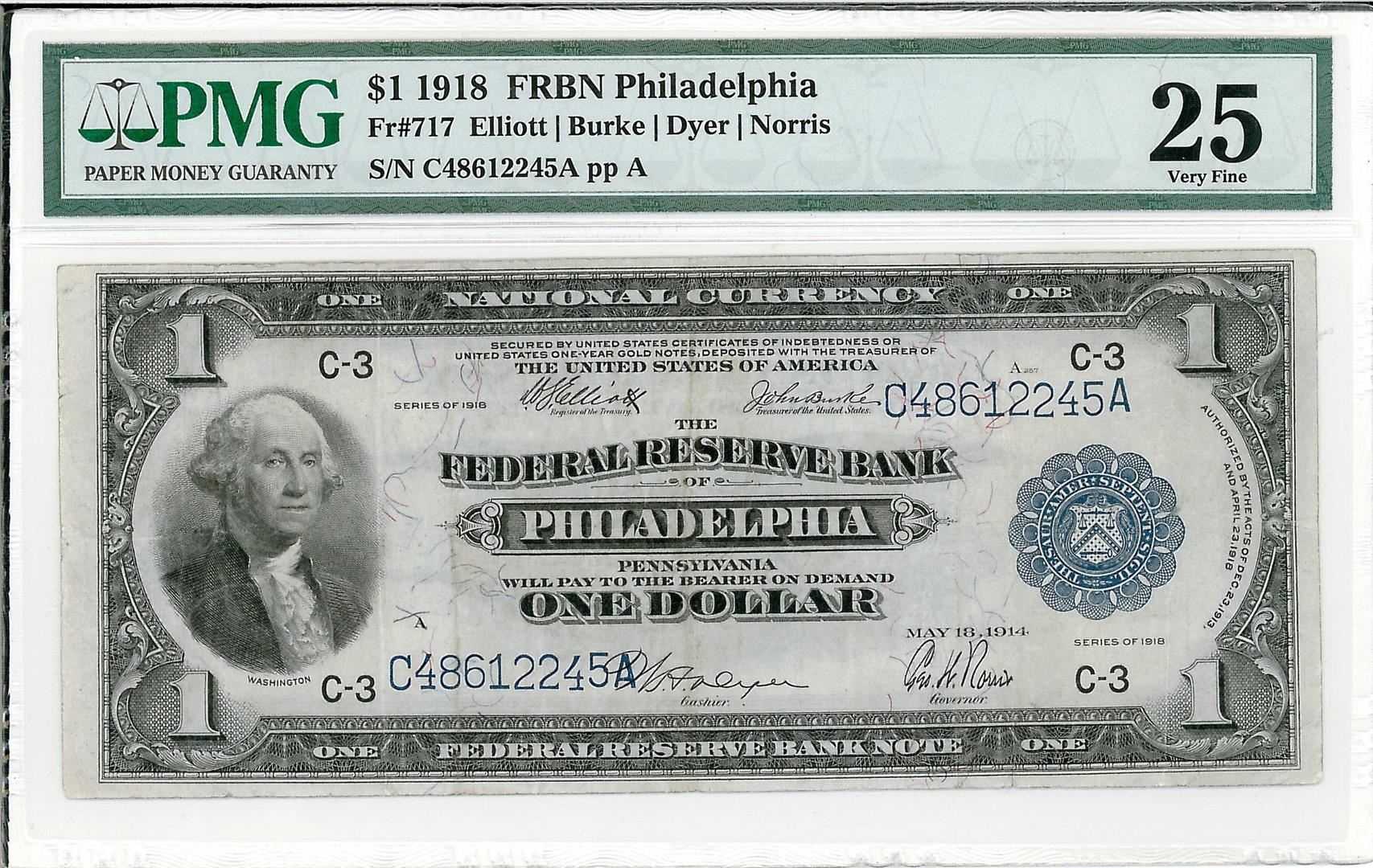One 1918 $1 FRBN Federal Reserve Bank Note Philadephia PMG 25 Very Fine. The serial number is 48612245.