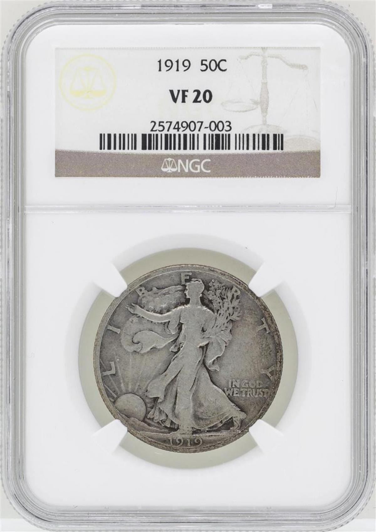 One 1919 Walking Liberty Half Dollar Coin NGC VF20. NGC Certified.