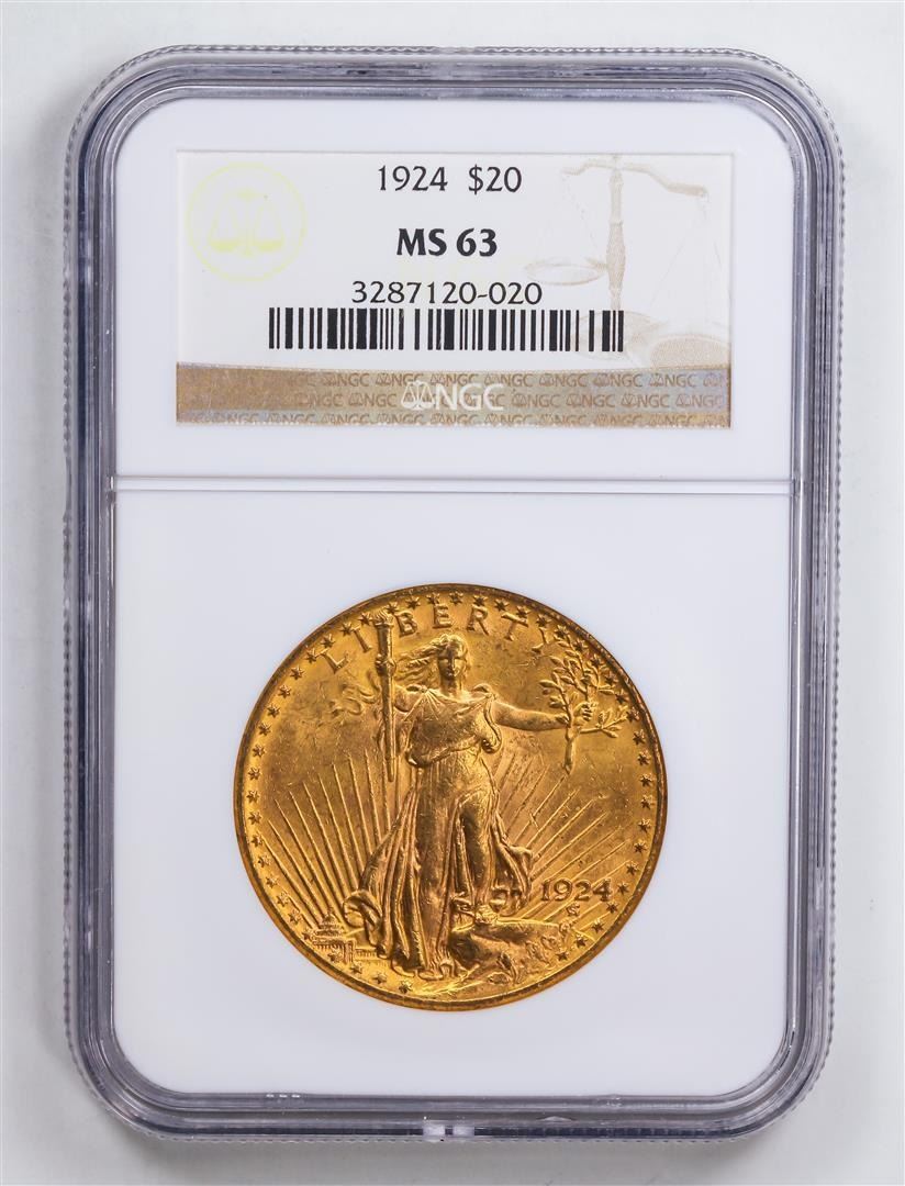 One 1924 $20 Double Eagle Gold Coin NGC MS63.