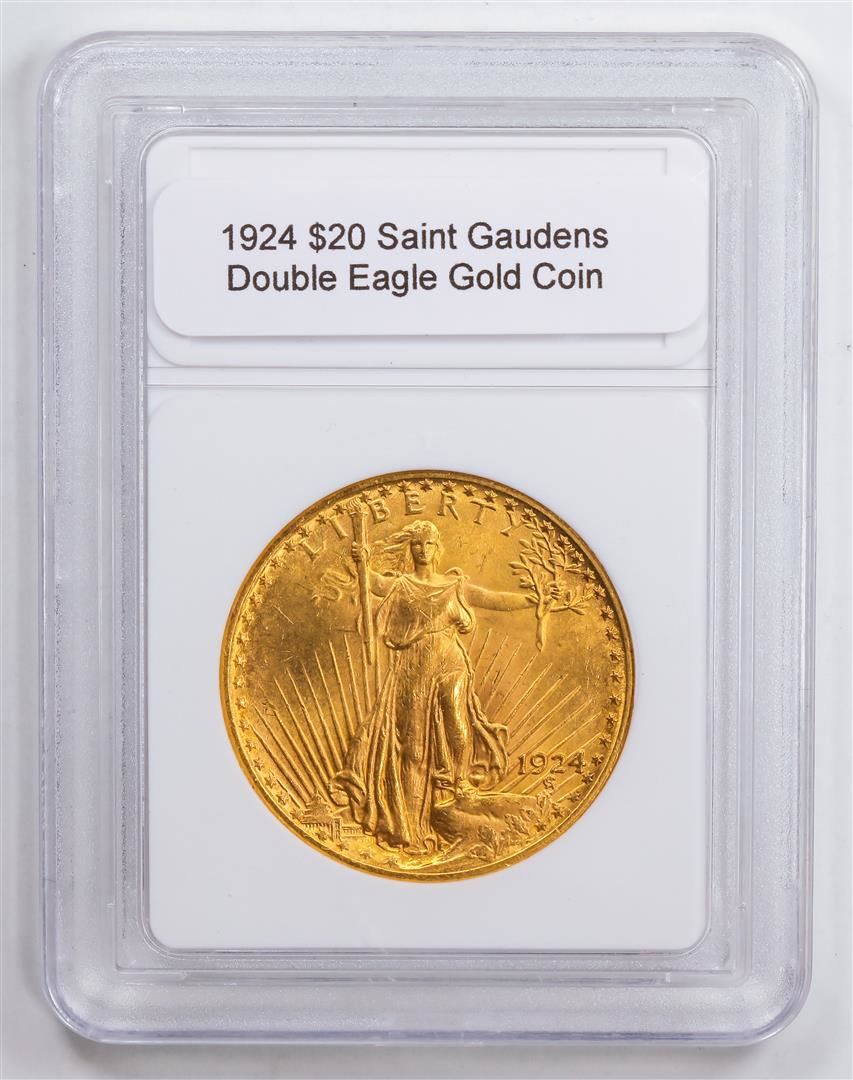 One 1924 $20 Saint Gaudens Double Eagle Gold Coin.