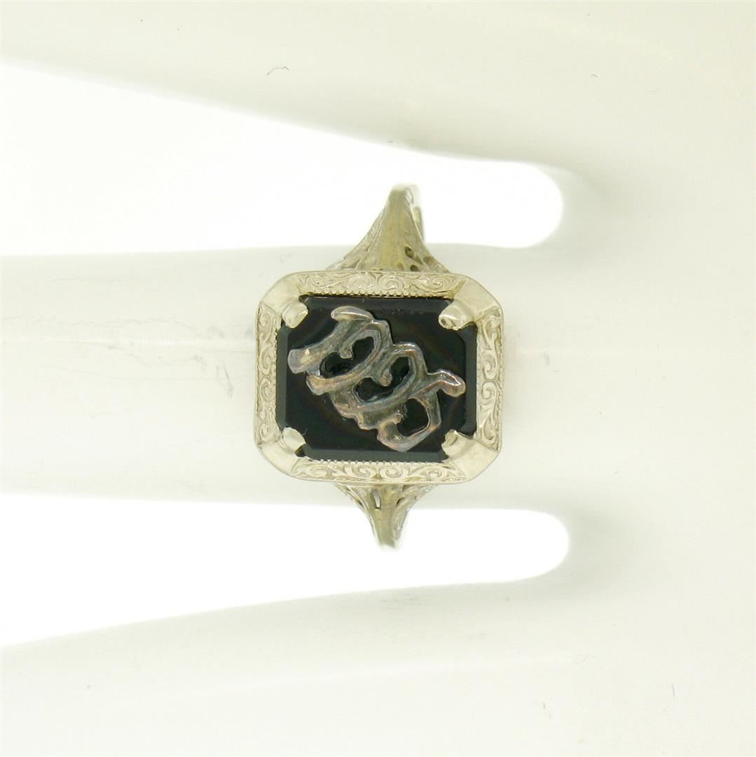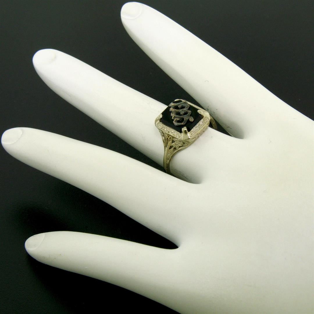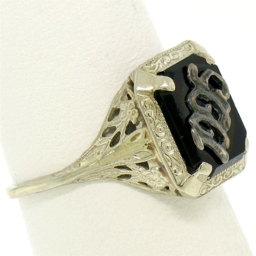 One Antique Art Deco 14k White Gold Prong Set Black Onyx Filigree Dinner Ring 1925. Item Details: Material: 14K Solid White Gold, Weight: 2.3 Grams, Stone(s): (1) Natural Genuine Onyx - Rectangular Cut - Prong Set - Pure Black Color - 10x8mm (approx.), Ring Size: 6.5 (We can custom size this ring.), Ring Width: 12.6mm, Ring Height: 6mm rise off the finger, Condition: Antique, art deco period piece with original finish. Ready to wear!