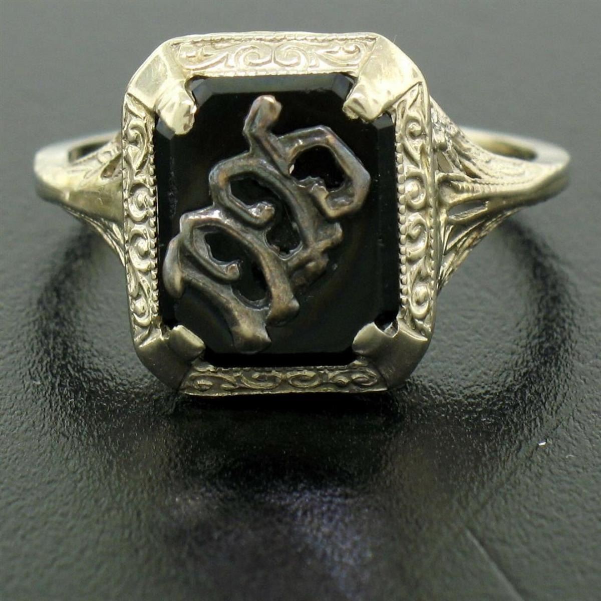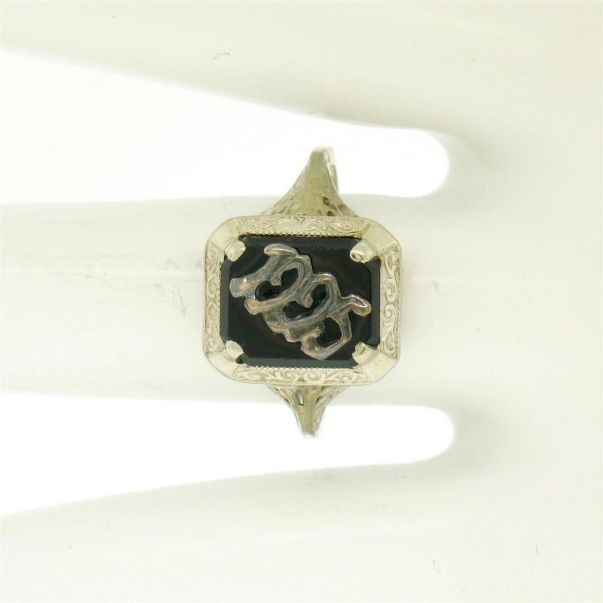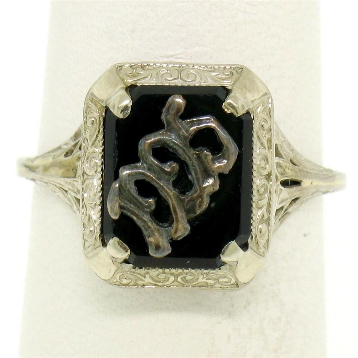 One Antique Art Deco 14k White Gold Prong Set Black Onyx Filigree Dinner Ring 1925. Item Details: Material: 14K Solid White Gold, Weight: 2.3 Grams, Stone(s): (1) Natural Genuine Onyx - Rectangular Cut - Prong Set - Pure Black Color - 10x8mm (approx.), Ring Size: 6.5 (We can custom size this ring.), Ring Width: 12.6mm, Ring Height: 6mm rise off the finger, Condition: Antique, art deco period piece with original finish. Ready to wear!