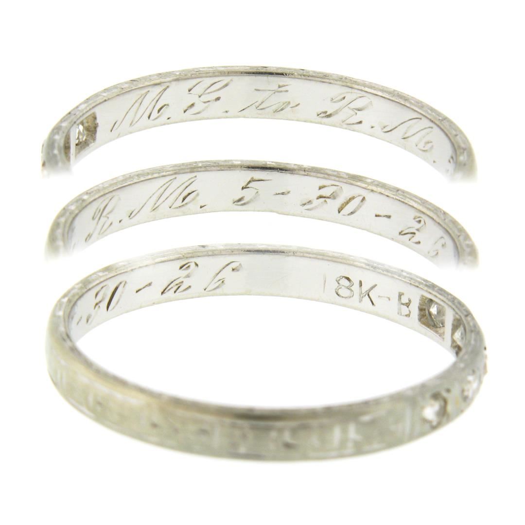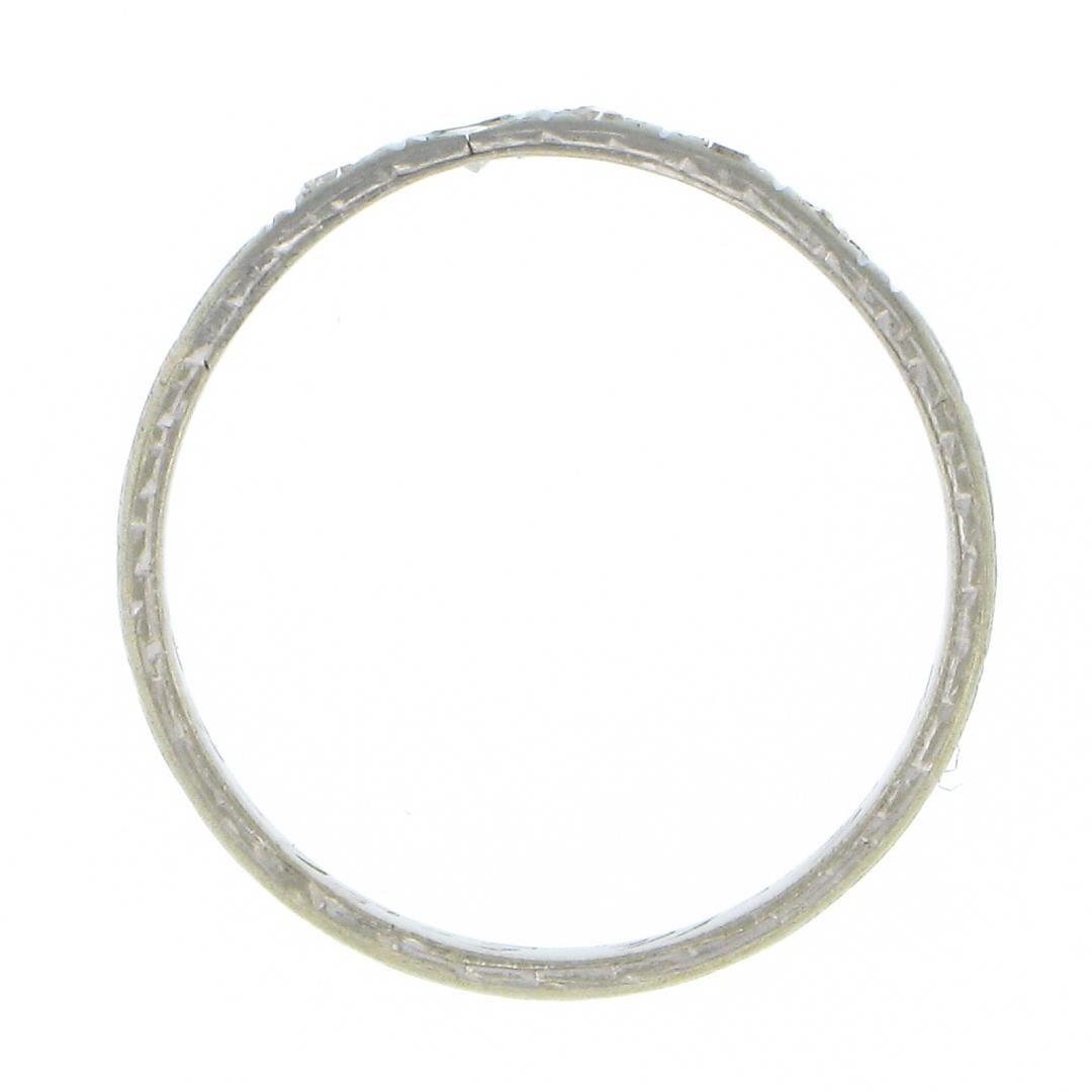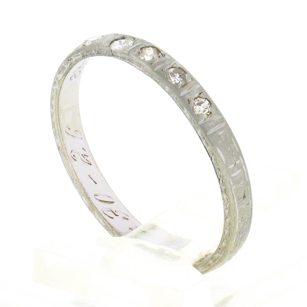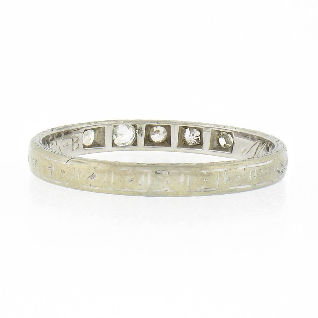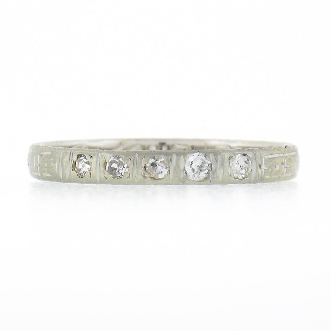 An antique solid 18k white gold band ring, with 5 old single cut natural diamonds (G/H - SI2/I1 ; 0.08ctw). The ring is size 6.0, weighs a total of 1.59 grams, and measures 2.35mm wide.