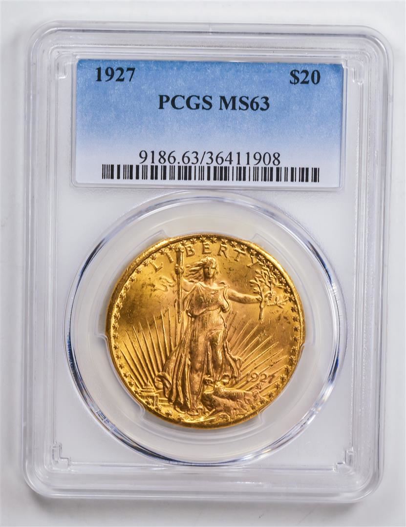 One 1927 $20 Double Eagle Gold Coin PCGS MS63.