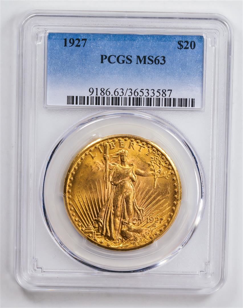 One 1927 $20 Double Eagle Gold Coin PCGS MS63.