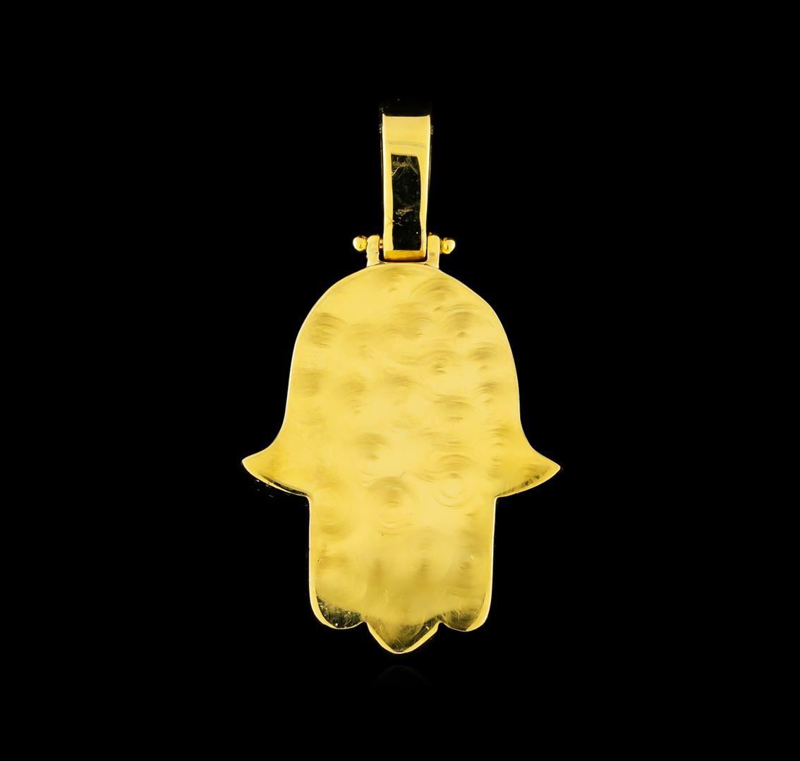 One electronically tested 14KT yellow gold cast & assembled diamond "hamsa" pendant with a bright polish finish. The pendant features a diamond encrusted hamsa motif, completed by a diamond set bail. Area measurements with bail 1.62 x 0.87 inch. In all faiths the hamsa is a protective sign. It is believed that wearing hamsa jewelry brings the owner happiness, luck, health, and good fortune. Condition is new, good workmanship. Containing: Twenty-Five prong set round brilliant cut diamonds, measuring 2.00 - 1.80 x 1.14mm (depth est.) approximate total weight of 25 Stones = 0.70ct. The color grade reflects the entire range of color for this group. Graded in the setting. Clarity: SI-2 to I-1. Color: G - J Twelve prong set round brilliant cut diamonds, measuring 1.60 - 1.50 x 0.93mm (depth est.) approximate total weight of 12 Stones = 0.20ct. Graded in the setting. Clarity: SI-2 to I-1. Color: H - J One Hundred Forty-Three prong set round brilliant cut diamonds, measuring 1.30 - 1.20 x 0.75mm (depth est.) approximate total weight of 143 Stones = 1.10ct. The color grade reflects the entire range of color for this group. Graded in the setting. Clarity: SI-2 to I-1. Color: G - J. Total Weight of Diamonds 2.00ct. Total Weight of Pendant 12.28gm. AIG Appraised.
