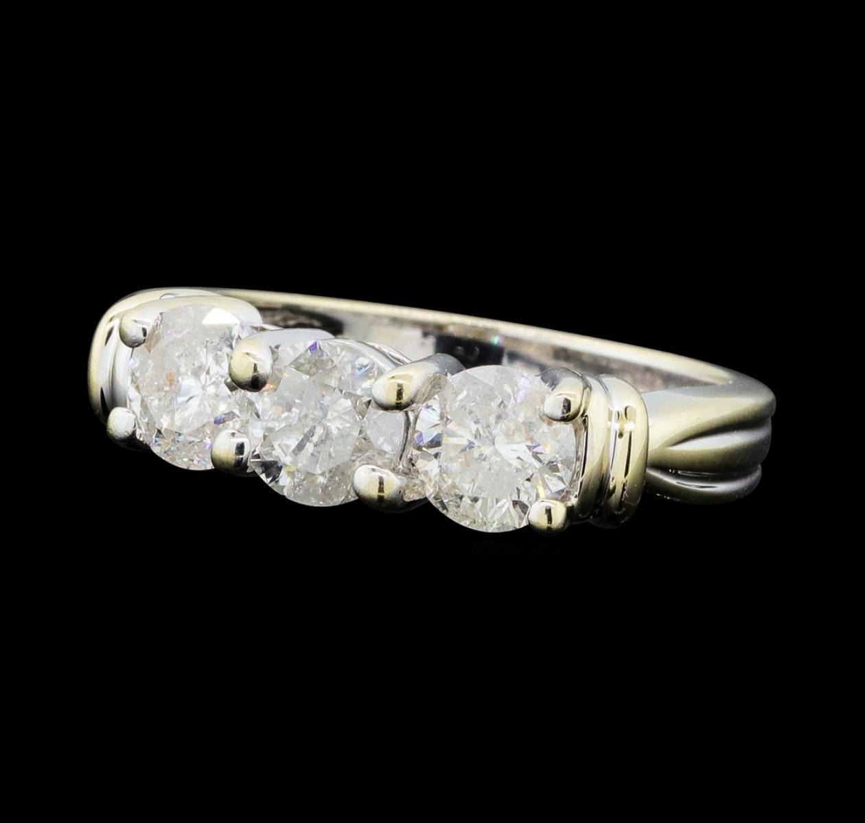 One electronically tested 14KT white gold lady's cast 3-stone ring with a tapered shank with a bright polish finish. The featured lady's ring has a shank measuring 2.70 millimeters wide. Identified with markings of '14K'. Condition is new, good workmanship. Containing: Three prong set round brilliant cut diamonds, measuring 5.50 - 5.44 x 3.55mm (depth est.) approximate total weight of 3 Stones = 2.00ct. Graded in the setting. Color H - I Clarity I-2 Cut Good. Total Weight of Diamonds 2.00ct.. Total Weight of Ring 5.40gm GAS Appraised at $6695.00. GAS Appraised at $6,695.00.