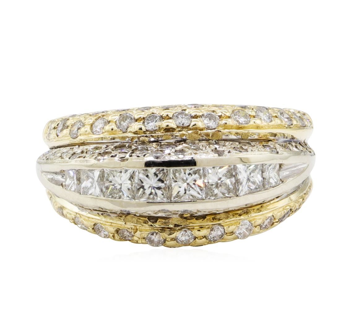 One electronically tested 14KT yellow and white gold lady's combination cast & assembled fashion ring with a domed three section band with a bright polish finish. The featured lady's ring has a double shank measuring 4.30 millimeters wide. Identified with markings of '14K'. Condition is used, good workmanship. Containing: Eight channel set princess cut diamonds, measuring 2.90 x 2.00 x 1.50mm (depth est.) approximate total weight of 8 Stones = 0.60ct. Graded in the setting. Color H - I Clarity VS-2 to SI-1 Cut Very Good Ninety-Seven bead set round brilliant cut diamonds, measuring 1.80 - 1.30 x 0.96mm (depth est.) approximate total weight of 97 Stones = 1.40ct. Graded in the setting. Color H - I Clarity VS-2 to SI-2 Cut Good. Total Weight of Diamonds 2.00ct.. Total Weight of Ring 7.70gm GAS Appraised at $3260.00. GAS Appraised.