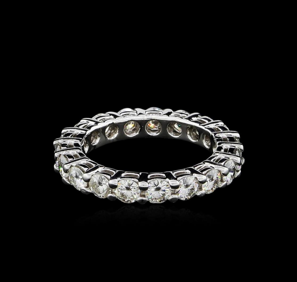 One electronically tested 14KT white gold ladies cast moissanite eternity ring with a bright polish finish. The ring features a continuous three millimeter wide moissanite ribbon. Ring size 5. Condition is good. Containing: Nineteen prong set round brilliant cut laboratory created moissanite, measuring 3.02 - 3.00 x 1.75mm, approximate total weight of 2.00ct., clarity is eye clean, colorless, very slightly grayish, white color, (GIA W 0/3), cut is good. Transmitting light with not distortion, transparent. Color grade is an average for the group. Graded in the setting. Moissanite is cut with the table perpendicular to the "c" axis. By looking through the table of a moissanite, the singly refractive direction, no doubling will appear. Looking through the crown or pavilion facets doubling (the doubly refractive direction) will be visible. Laboratory created moissanite is a diamond stimulant, man-made material with no gem-quality natural counterpart, but gives positive reaction to a standard diamond tester. Laboratory created moissanite has extreme fire, much more than a diamond equivalent size and cut. Total Weight of Colored Stones 2.00ct. Total Weight of Ring 3.97gm. AIG Appraised.