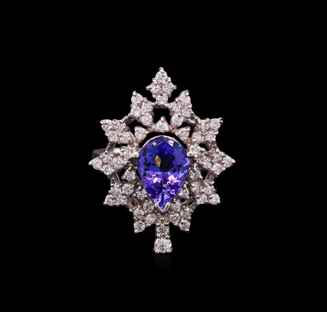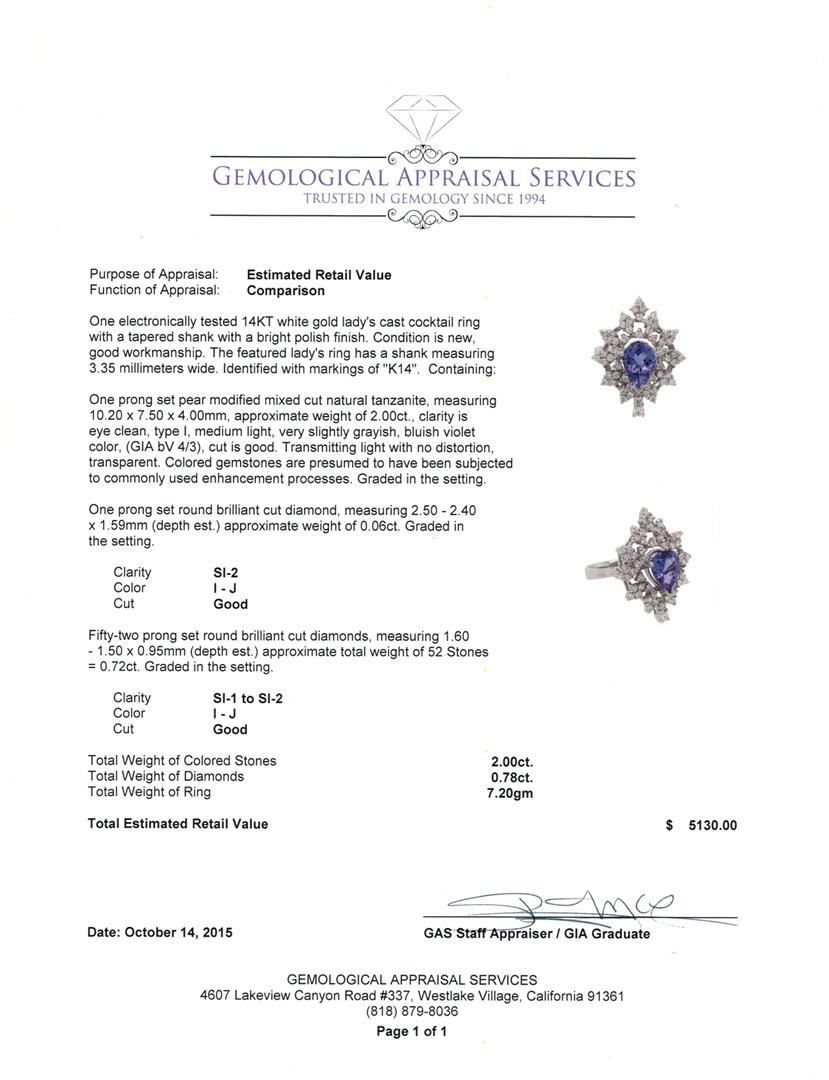 One electronically tested 14KT white gold lady's cast cocktail ring with a tapered shank with a bright polish finish. The featured lady's ring has a shank measuring 3.35 millimeters wide. Identified with markings of "K14". Condition is new, good workmanship. Containing: One prong set pear modified mixed cut natural tanzanite, measuring 10.20 x 7.50 x 4.00mm, approximate weight of 2.00ct., clarity is eye clean, type I, medium light, very slightly grayish, bluish violet color, (GIA bV 4/3), cut is good. Transmitting light with no distortion, transparent. Colored gemstones are presumed to have been subjected to commonly used enhancement processes. Graded in the setting. One prong set round brilliant cut diamond, measuring 2.50 - 2.40 x 1.59mm (depth est.) approximate weight of 0.06ct. Graded in the setting. Clarity: SI-2. Color: I - J. Cut Good Fifty-Two prong set round brilliant cut diamonds, measuring 1.60 - 1.50 x 0.95mm (depth est.) approximate total weight of 52 Stones = 0.72ct. Graded in the setting. Clarity: SI-1 to SI-2. Color: I - Good. Total Weight of Colored Stones 2.00ct. Total Weight of Diamonds 0.78ct. Total Weight of Ring 7.20gm. GAS Appraised.