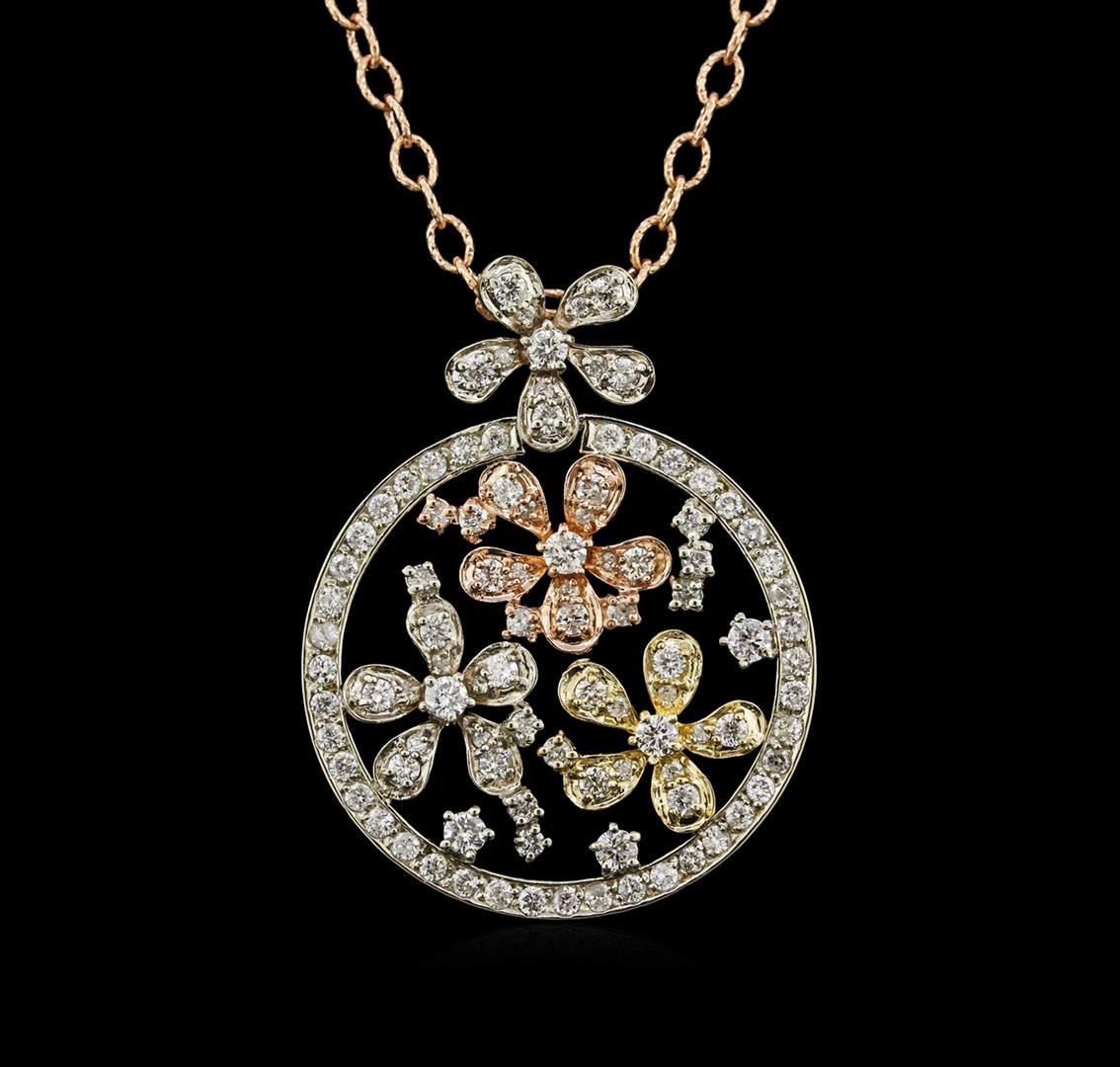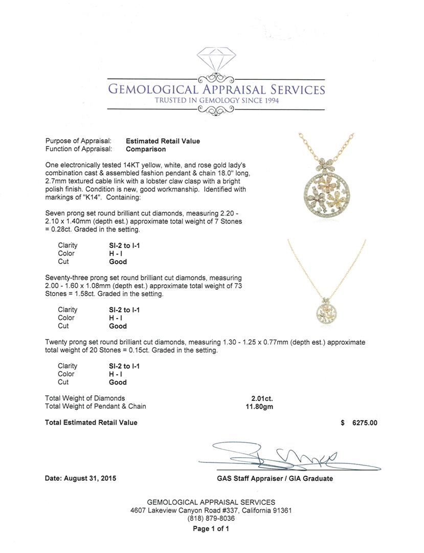 One electronically tested 14KT yellow, white, and rose gold lady's combination cast & assembled fashion pendant & chain 18.0" long, 2.7mm textured cable link with a lobster claw clasp with a bright polish finish. Identified with markings of "K14". Condition is new, good workmanship. Containing: Seven prong set round brilliant cut diamonds, measuring 2.20 - 2.10 x 1.40mm (depth est.) approximate total weight of 7 Stones = 0.28ct. Graded in the setting. Clarity: SI-2 to I-1. Color: H - I. Cut Good Seventy-Three prong set round brilliant cut diamonds, measuring 2.00 - 1.60 x 1.08mm (depth est.) approximate total weight of 73 Stones = 1.58ct. Graded in the setting. Clarity: SI-2 to I-1. Color: H - I. Cut Good Twenty prong set round brilliant cut diamonds, measuring 1.30 - 1.25 x 0.77mm (depth est.) approximate total weight of 20 Stones = 0.15ct. Graded in the setting. Clarity: SI-2 to I-1. Color: H - I. Cut Good. Total Weight of Diamonds 2.01ct. Total Weight of Pendant & Chain 11.80gm. GAS Appraised.
