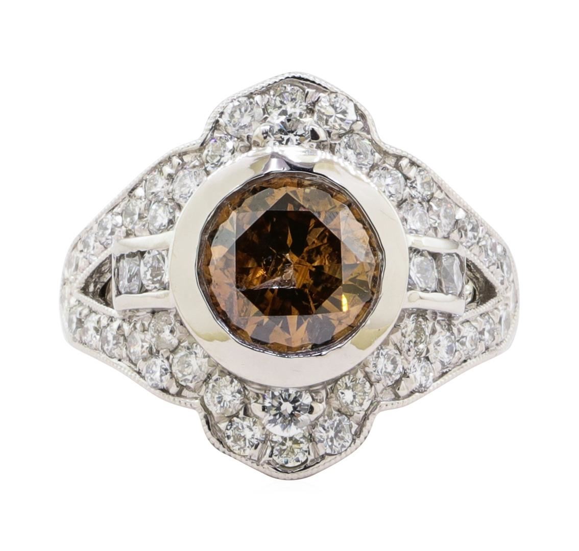 One electronically tested platinum ladies cast & assembled diamond ring. The featured fancy brown diamond is set within a gallery of white diamonds, supported by an elaborate lattice undercarriage and diamond set shoulders, completed by a three millimeter wide band. Bright polish finish with milgrain detailing throughout. Trademark is Orianne. Identified with markings of "PT950". Condition is new, good workmanship. Containing: One bezel set round brilliant cut diamond, measuring 8.00 - 8.00 x 5.12mm (depth est.) approximate weight of 2.01ct. Graded in the setting. Clarity I-1 Depth 64.0% Table 62.5% Forty-Six bead set round brilliant cut diamonds, measuring 2.50 - 1.50 x 1.20mm (depth est.) approximate total weight of 46 Stones = 1.25ct. Graded in the setting. Clarity SI-1 to I-1 Color E - G Total Weight of Diamonds 3.26 ct. Total Weight of Ring 13.90 gm Estimated Retail Value $ 33,400.00 US