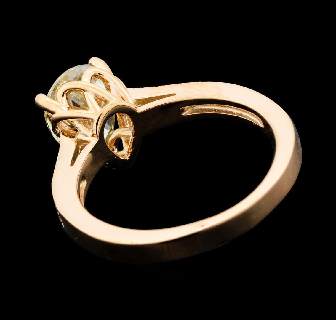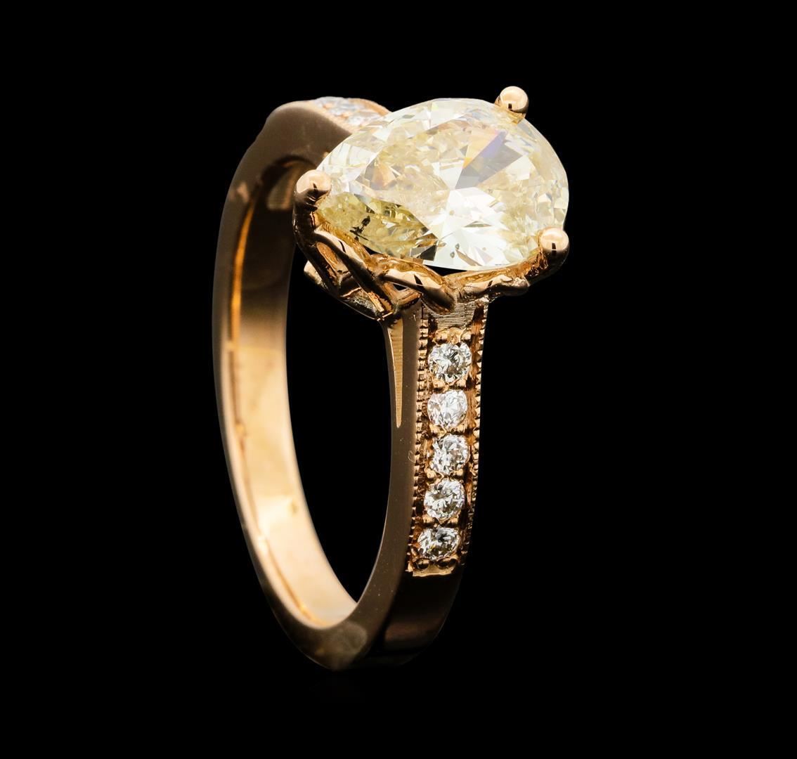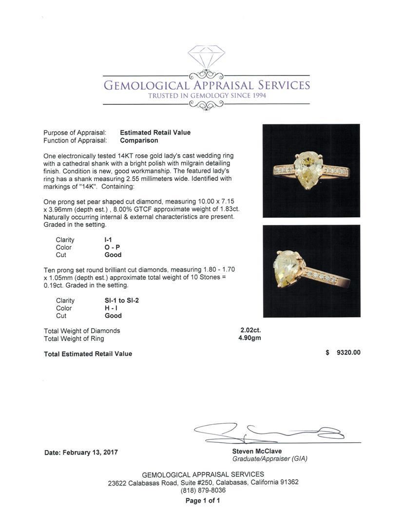 One electronically tested 14KT rose gold lady's cast wedding ring with a cathedral shank with a bright polish with milgrain detailing finish. The featured lady's ring has a shank measuring 2.55 millimeters wide. Identified with markings of '14K'. Condition is new, good workmanship. Containing: One prong set pear shaped cut diamond, measuring 10.00 x 7.15 x 3.96mm (depth est.) , 8.00.%. GTCF approximate weight of 1.83ct. Naturally occurring internal & external characteristics are present. Graded in the setting. Clarity I-1. Color: O - P Cut Good Ten prong set round brilliant cut diamonds, measuring 1.80 - 1.70 x 1.05mm (depth est.) approximate total weight of 10 Stones = 0.19ct. Graded in the setting. Clarity SI-1 to SI-2. Color: H - I Cut Good. Total Weight of Diamonds 2.02ct.. Total Weight of Ring 4.90gm. GAS Appraised.