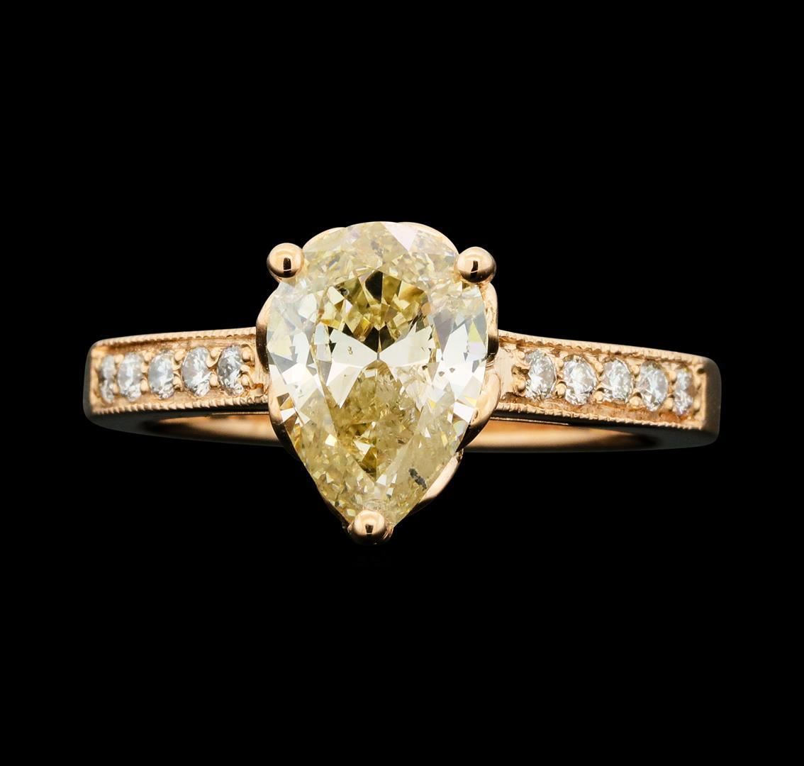 One electronically tested 14KT rose gold lady's cast wedding ring with a cathedral shank with a bright polish with milgrain detailing finish. The featured lady's ring has a shank measuring 2.55 millimeters wide. Identified with markings of '14K'. Condition is new, good workmanship. Containing: One prong set pear shaped cut diamond, measuring 10.00 x 7.15 x 3.96mm (depth est.) , 8.00.%. GTCF approximate weight of 1.83ct. Naturally occurring internal & external characteristics are present. Graded in the setting. Clarity I-1. Color: O - P Cut Good Ten prong set round brilliant cut diamonds, measuring 1.80 - 1.70 x 1.05mm (depth est.) approximate total weight of 10 Stones = 0.19ct. Graded in the setting. Clarity SI-1 to SI-2. Color: H - I Cut Good. Total Weight of Diamonds 2.02ct.. Total Weight of Ring 4.90gm. GAS Appraised.