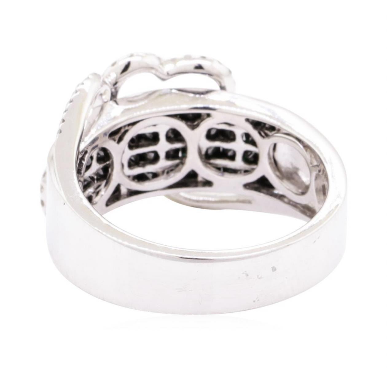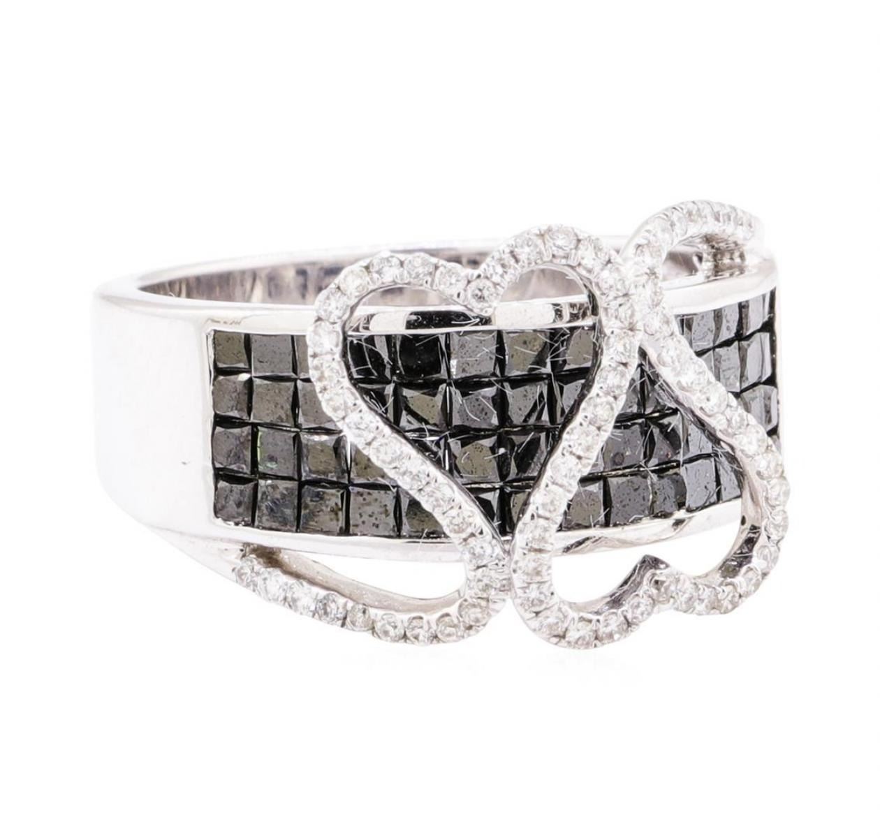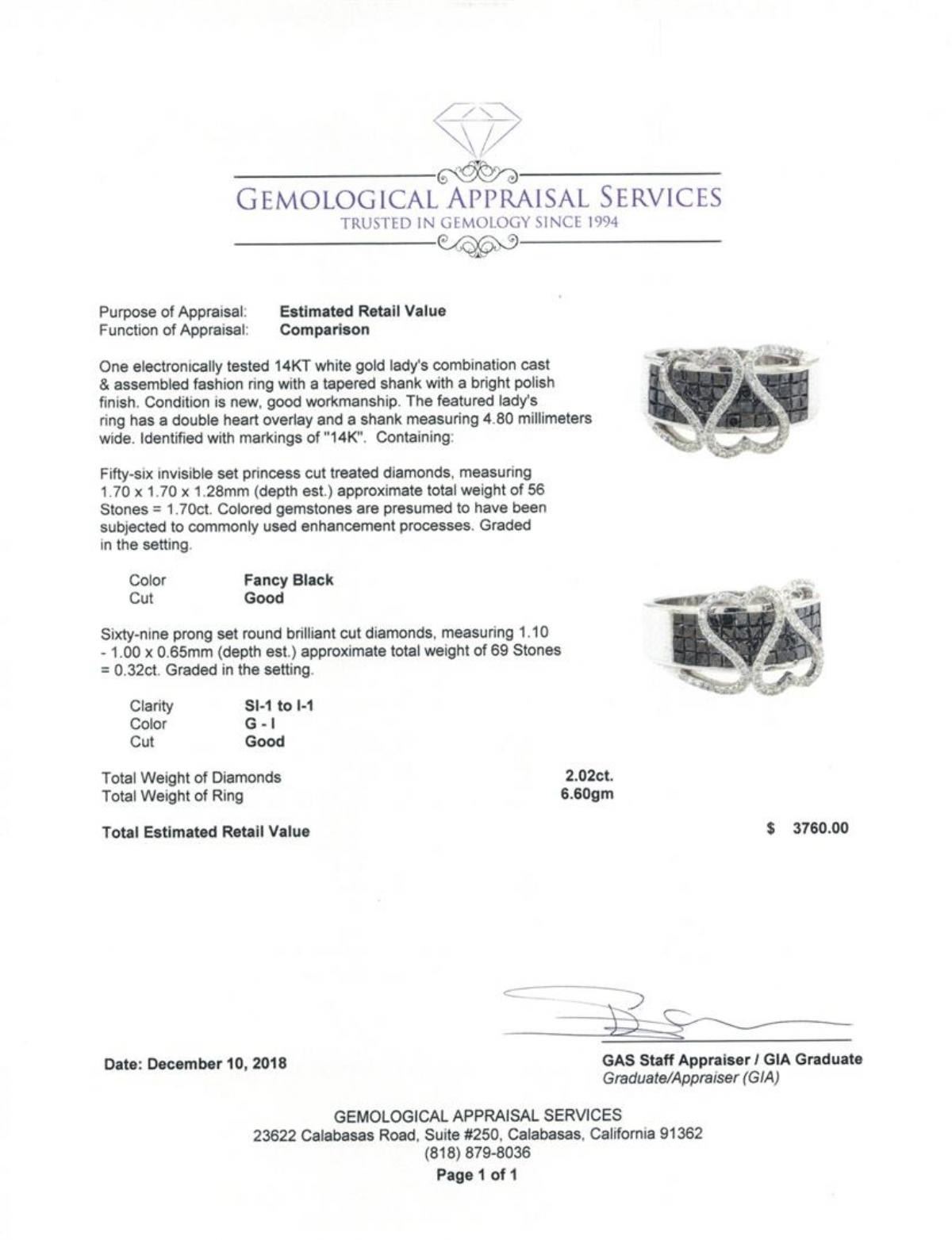 One electronically tested 14KT white gold lady's combination cast & assembled fashion ring with a tapered shank with a bright polish finish. The featured lady's ring has a double heart overlay and a shank measuring 4.80 millimeters wide. Identified with markings of '14K'. Condition is new, good workmanship. Containing: Fifty-Six invisible set princess cut treated diamonds, measuring 1.70 x 1.70 x 1.28mm (depth est.) approximate total weight of 56 Stones = 1.70 ct. Colored gemstones are presumed to have been subjected to commonly used enhancement processes. Graded in the setting. Color Fancy Black Cut Good Sixty-Nine prong set round brilliant cut diamonds, measuring 1.10 - 1.00 x 0.65mm (depth est.) approximate total weight of 69 Stones = 0.32ct. Graded in the setting. Color G - I Clarity SI-1 to I-1 Cut Good. Total Weight of Diamonds 2.02ct.. Total Weight of Ring 6.60gm GAS Appraised at $3760.00. GAS Appraised.