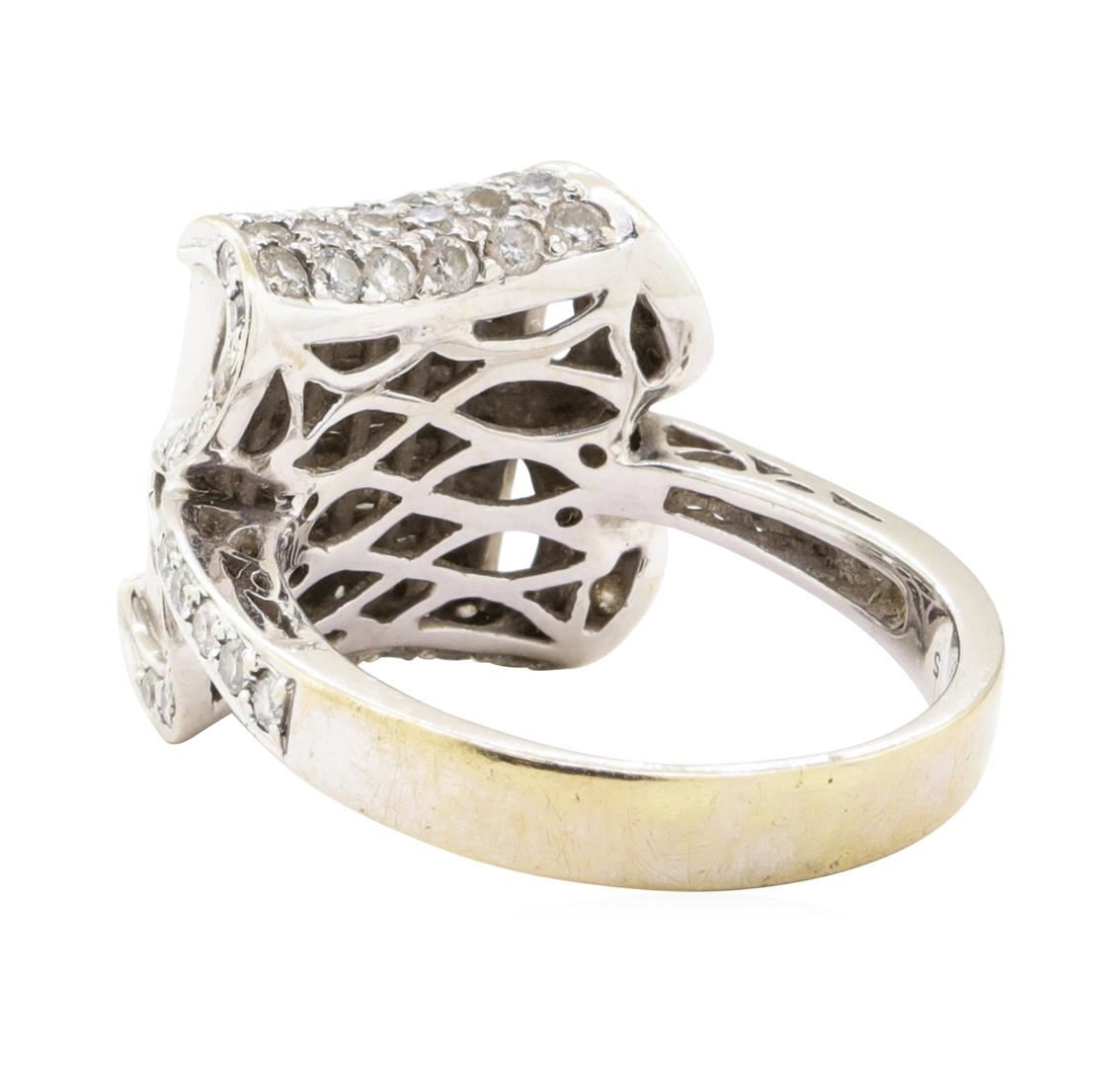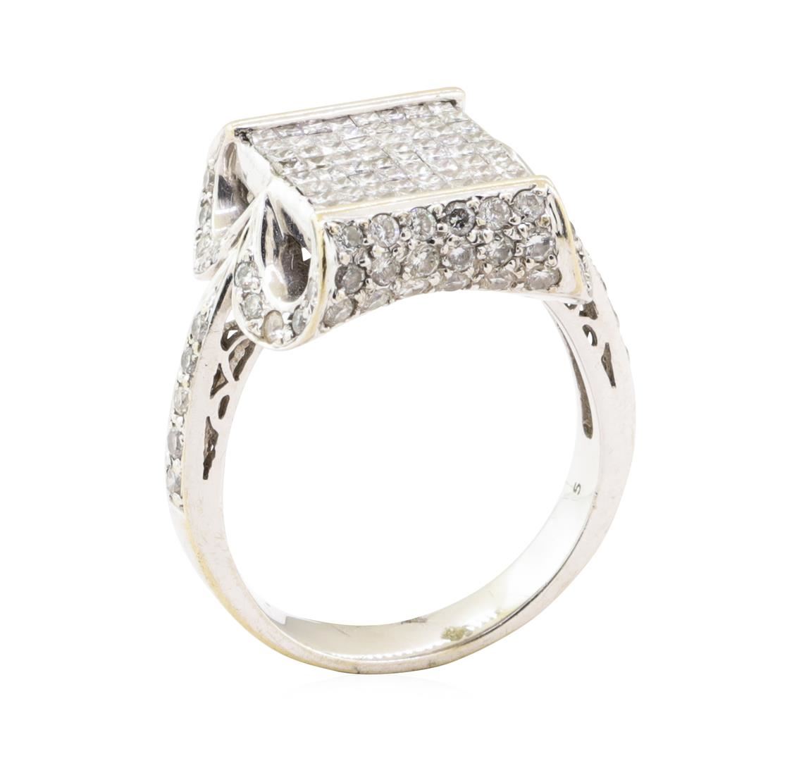One electronically tested 18KT white gold lady's cast fashion ring with a square top with scalloped edges with a bright polish finish. The featured lady's ring has a shank measuring 4.00 millimeters wide. Identified with markings of '18K'. Condition is new, good workmanship. Containing: Sixty-Four invisible set princess cut diamonds, measuring 1.30 x 1.30 x 0.98mm (depth est.) approximate total weight of 64 Stones = 0.90 ct. Graded in the setting. Color H - I Clarity SI-1 to I-1 Cut Good Sixty-Six prong set round brilliant cut diamonds, measuring 1.80 - 1.50 x 1.02mm (depth est.) approximate total weight of 66 Stones = 1.12ct. Graded in the setting. Color H - I Clarity SI-1 to I-1 Cut Good. Total Weight of Diamonds 2.02ct.. Total Weight of Ring 9.00gm GAS Appraised at $5630.00. GAS Appraised.