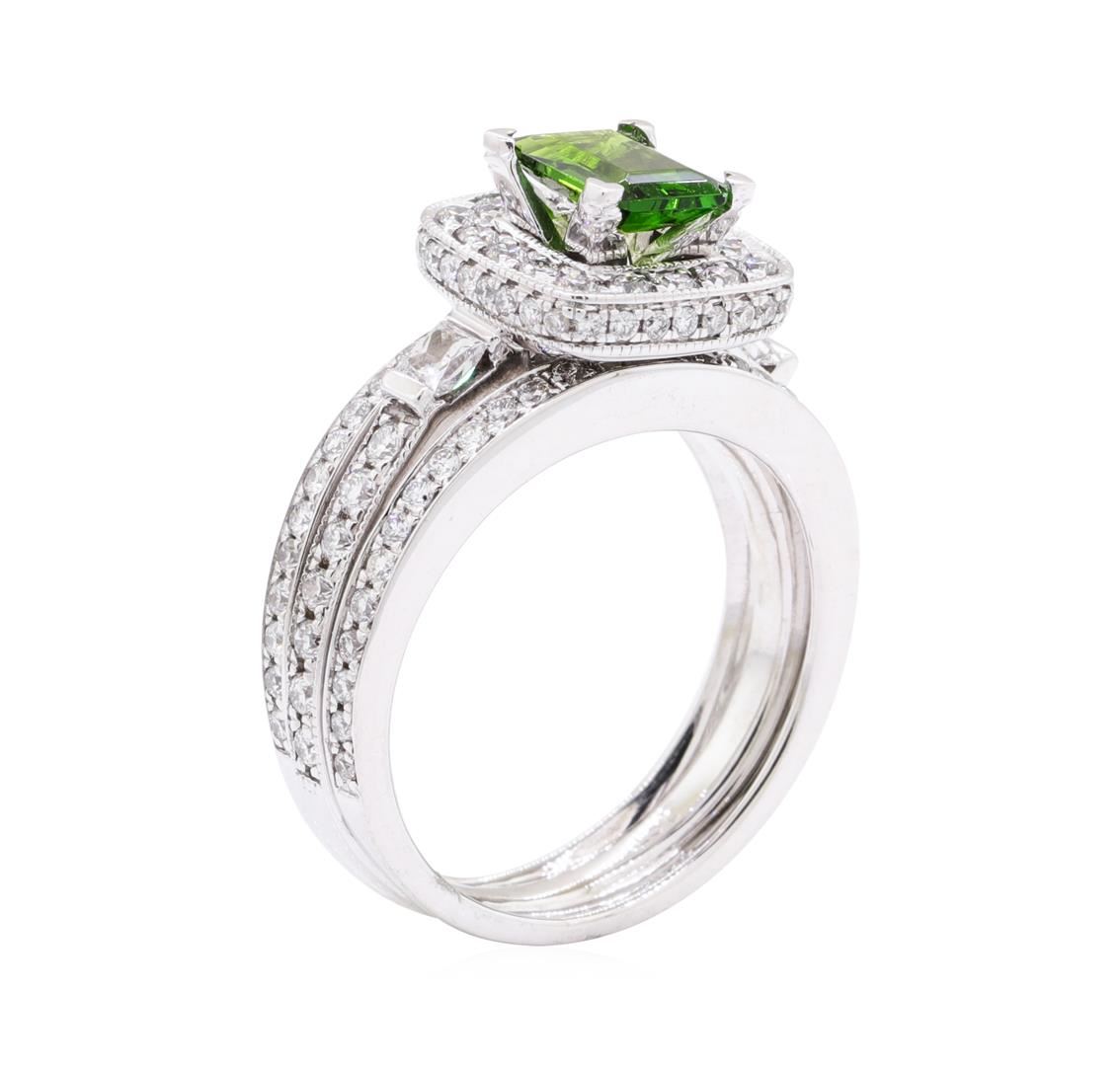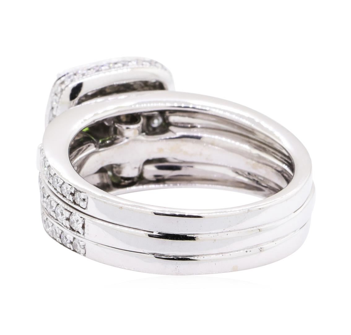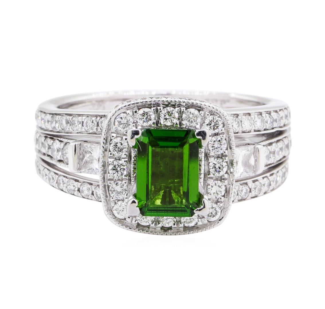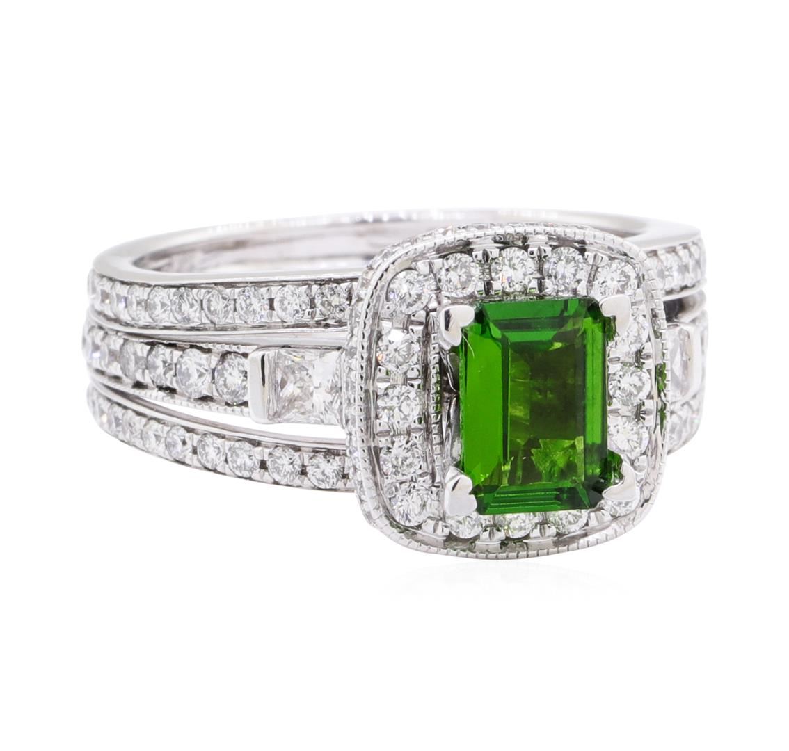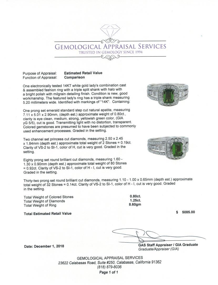 One electronically tested 14KT white gold lady's combination cast & assembled fashion ring with a triple split shank with halo with a bright polish with milgrain detailing finish. The featured lady's ring has a triple shank measuring 5.20 millimeters wide. Identified with markings of '14K'. Condition is new, good workmanship. Containing: One prong set emerald standard step cut natural apatite, measuring 7.11 x 5.01 x 2.90mm, (depth est.) approximate weight of 0.80ct., clarity is eye clean, medium, strong, yellowish green color, (GIA yG 5/5), cut is good. Transmitting light with no distortion, transparent. Colored gemstones are presumed to have been subjected to commonly used enhancement processes. Graded in the setting. Two channel set princess cut diamonds, measuring 2.50 x 2.45 x 1.84mm (depth est.) approximate total weight of 2 Stones = 0.19ct. Graded in the setting. Color H Clarity VS-2 to SI-1 Cut Very Good Eighty prong set round brilliant cut diamonds, measuring 1.60 - 1.30 x 0.90mm (depth est.) approximate total weight of 80 Stones = 0.92ct. Graded in the setting. Color H - I Clarity VS-2 to SI-1 Cut Very Good Thirty-Two prong set round brilliant cut diamonds, measuring 1.10 - 1.00 x 0.65mm (depth est.) approximate total weight of 32 Stones = 0.14ct. Graded in the setting. Color H - I Clarity VS-2 to SI-1 Cut Very Good. Total Weight of Colored Stones 0.80ct.. Total Weight of Diamonds 1.25ct.. Total Weight of Ring 8.60gm GAS Appraised at $5085.00. GAS Appraised.
