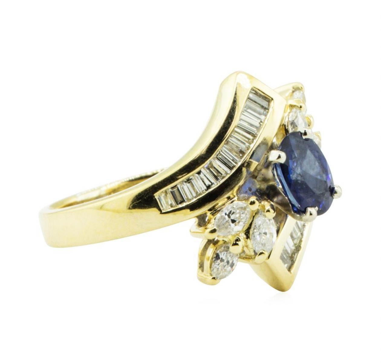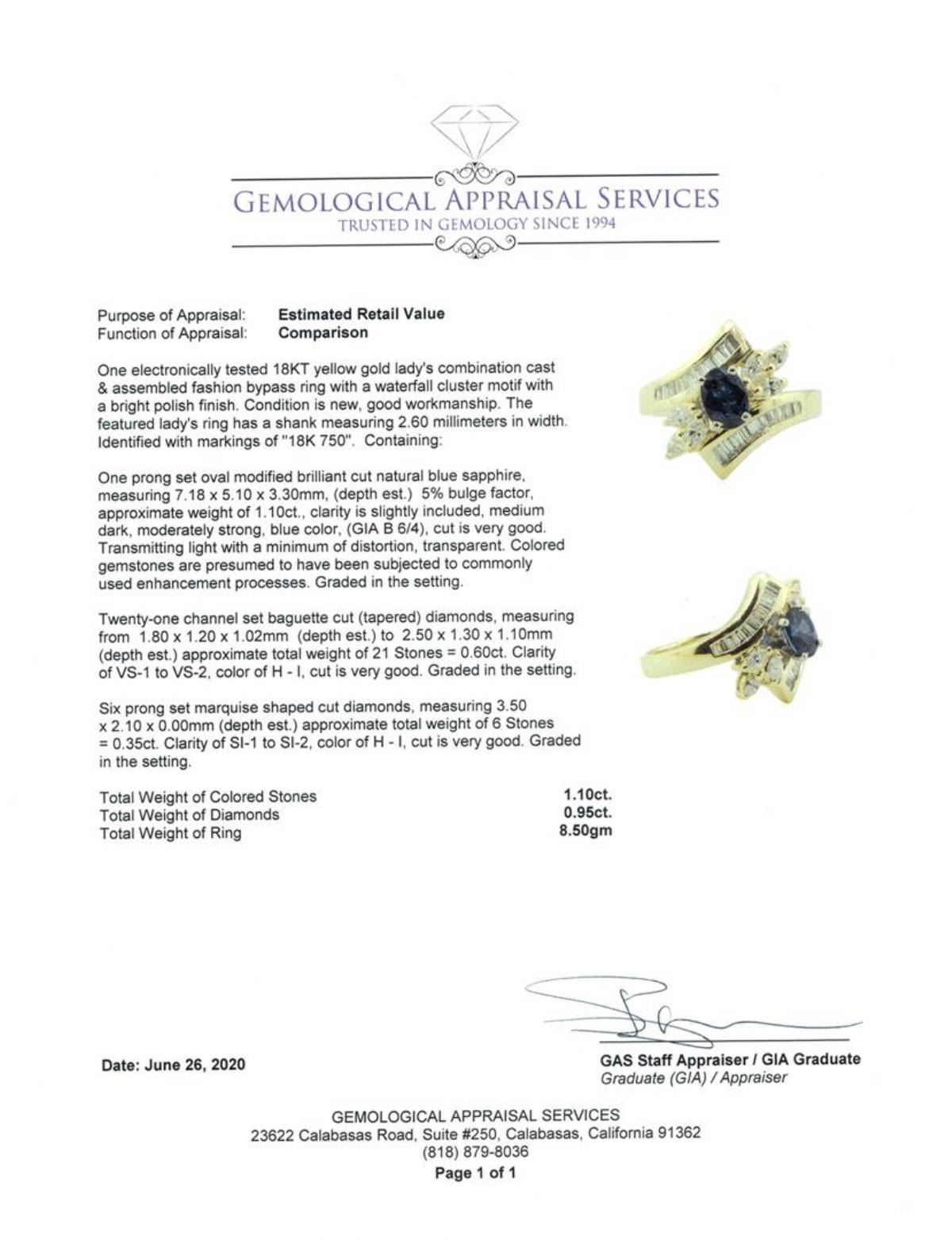 One electronically tested 18KT yellow gold lady's combination cast & assembled fashion bypass ring with a waterfall cluster motif with a bright polish finish. The featured lady's ring has a shank measuring 2.60 millimeters in width. Identified with markings of '18K 750'. Condition is new, good workmanship. Containing: One prong set oval modified brilliant cut natural blue sapphire, measuring 7.18 x 5.10 x 3.30mm, (depth est.) 5%. bulge factor, approximate weight of 1.10 ct., clarity is slightly included, medium dark, moderately strong, blue color, (GIA B 6/4), cut is very good. Transmitting light with a minimum of distortion, transparent. Colored gemstones are presumed to have been subjected to commonly used enhancement processes. Graded in the setting. Twenty-One channel set baguette cut (tapered) diamonds, measuring from 1.80 x 1.20 x 1.02mm (depth est.) to 2.50 x 1.30 x 1.10mm (depth est.) approximate total weight of 21 Stones = 0.60 ct. Graded in the setting. Color H - I Clarity VS-1 to VS-2 Cut Very Good Six prong set marquise shaped cut diamonds, measuring 3.50 x 2.10 x 0.00mm (depth est.) approximate total weight of 6 Stones = 0.35ct. Graded in the setting. Color H - I Clarity SI-1 to SI-2 Cut Very Good. Total Weight of Colored Stones 1.10 ct.. Total Weight of Diamonds 0.95ct.. Total Weight of Ring 8.50gm GAS Appraised at $5380.00. GAS Appraised.