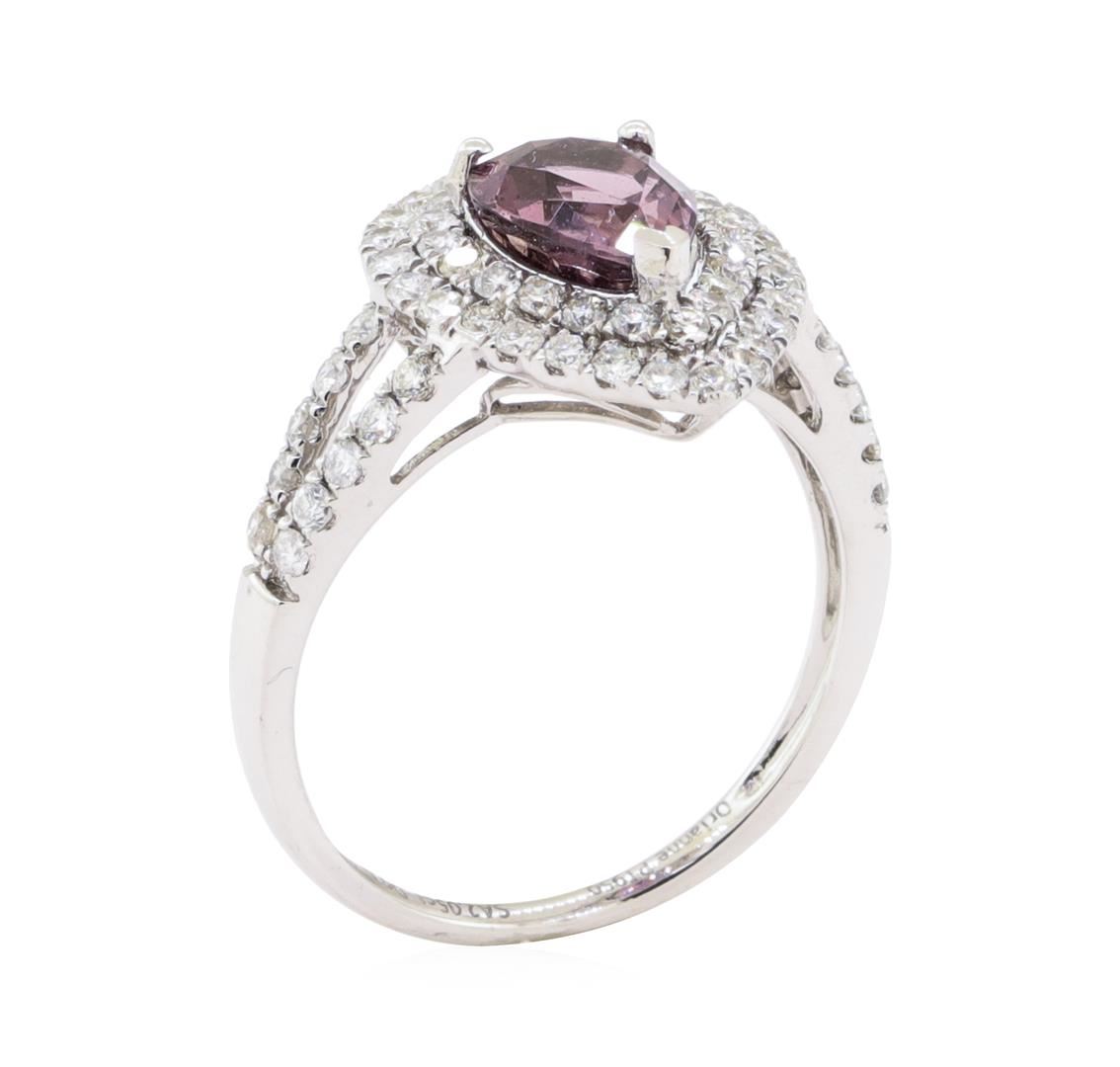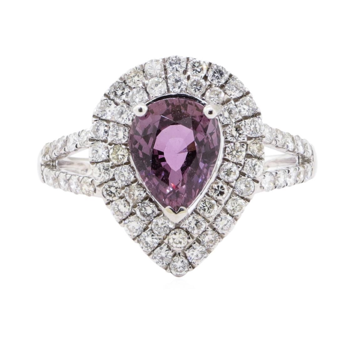 One electronically tested platinum ladies cast purple-pink sapphire and diamond ring with a bright polish finish. The featured purple-pink sapphire is set within two tiered diamond bezels supported by diamond set split shoulders, completed by a one and one-half millimeter wide band. Trademark is Orianne. Identified with markings of "PT950". Condition is new, good workmanship. Containing: One prong set pear mixed cut natural purple-pink sapphire, measuring 8.57 x 6.61 x 4.64mm, exact weight 2.05ct. Clarity is slightly included, medium dark, very slightly grayish, purple-pink color, (GIA PPi 6/3), cut is good. Transmitting light with a minimum of distortion, transparent. Naturally occurring internal & external characteristics are present. No indications of heating. GIA Gemological Report attached. Graded loose prior to setting in the GIA Laboratory, Report #5181163853. Sixty-Six prong set round brilliant cut diamonds approximate total weight of 66 Stones = 0.83ct. Graded in the setting. Clarity VS-2 to SI-1 Color G - I Total Weight of Colored Stones 2.05 ct. Total Weight of Diamonds 0.83 ct. Total Weight of Ring 5.14 gm Estimated Retail Value $ 14,660.00 US