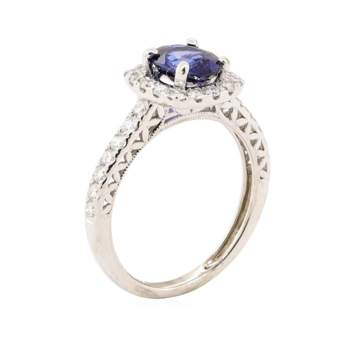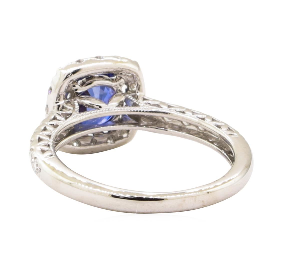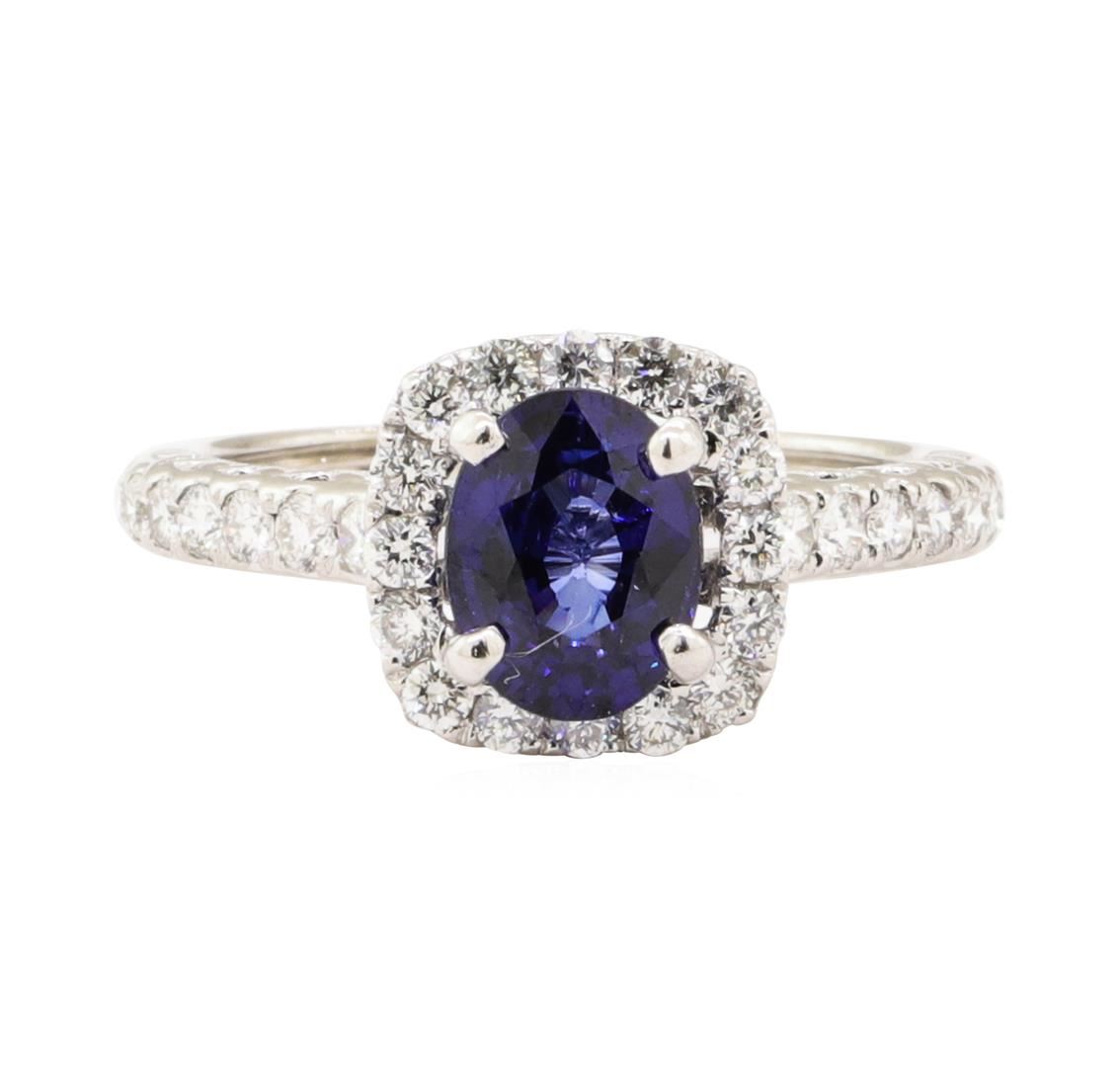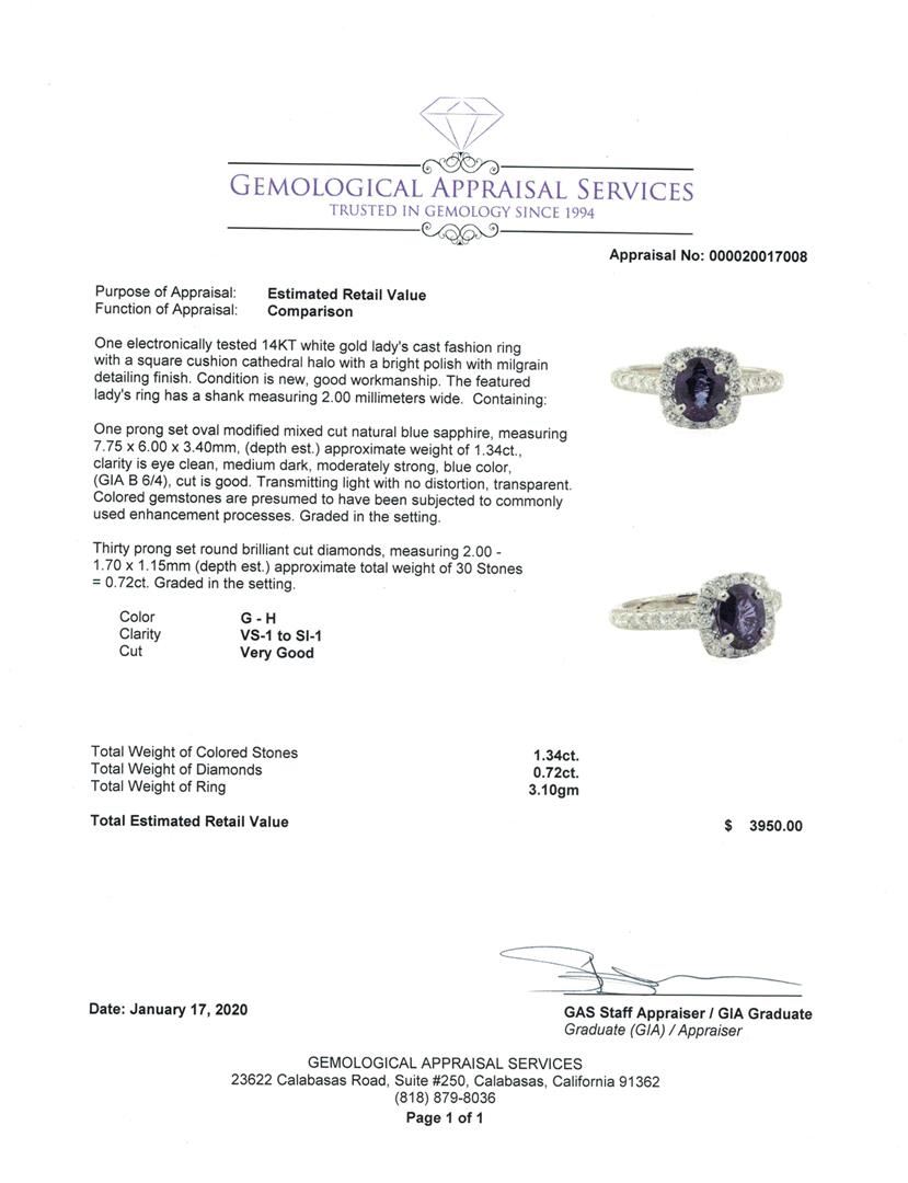 One electronically tested 14KT white gold lady's cast fashion ring with a square cushion cathedral halo with a bright polish with milgrain detailing finish. The featured lady's ring has a shank measuring 2.00 millimeters wide. Condition is new, good workmanship. Containing: One prong set oval modified mixed cut natural blue sapphire, measuring 7.75 x 6.00 x 3.40mm, (depth est.) approximate weight of 1.34ct., clarity is eye clean, medium dark, moderately strong, blue color, (GIA B 6/4), cut is good. Transmitting light with no distortion, transparent. Colored gemstones are presumed to have been subjected to commonly used enhancement processes. Graded in the setting. Thirty prong set round brilliant cut diamonds, measuring 2.00 - 1.70 x 1.15mm (depth est.) approximate total weight of 30 Stones = 0.72ct. Graded in the setting. Color G - H Clarity VS-1 to SI-1 Cut Very Good. Total Weight of Colored Stones 1.34ct.. Total Weight of Diamonds 0.72ct.. Total Weight of Ring 3.10gm GAS Appraised at $3950.00. GAS Appraised.