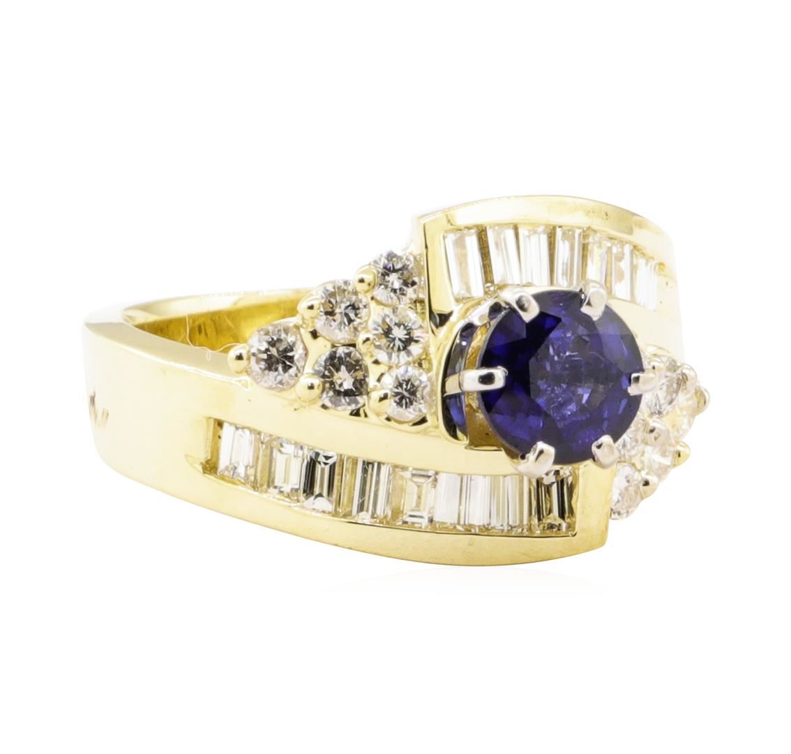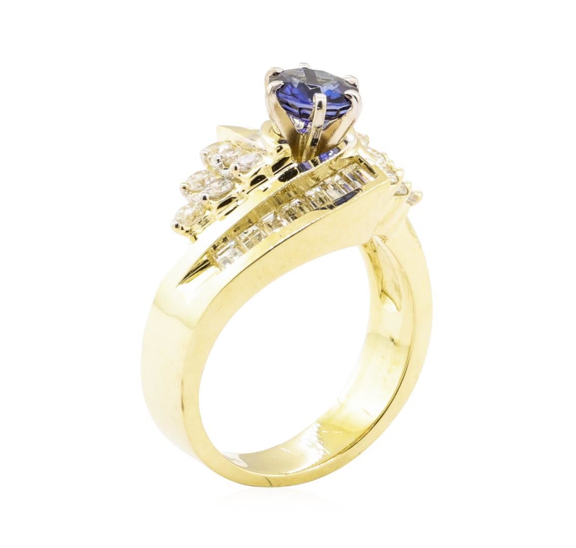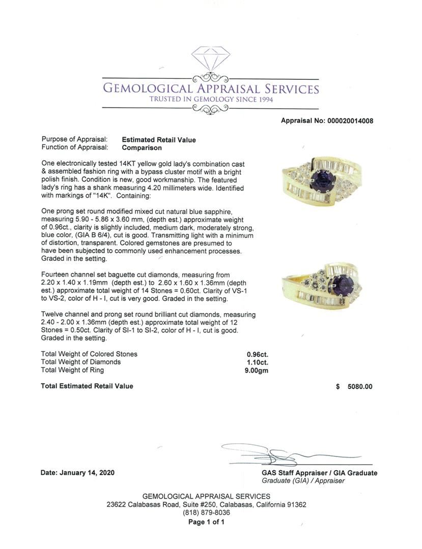 One electronically tested 14KT yellow gold lady's combination cast & assembled fashion ring with a bypass cluster motif with a bright polish finish. The featured lady's ring has a shank measuring 4.20 millimeters wide. Identified with markings of '14K'. Condition is new, good workmanship. Containing: One prong set round modified mixed cut natural blue sapphire, measuring 5.90 - 5.86 x 3.60 mm, (depth est.) approximate weight of 0.96ct., clarity is slightly included, medium dark, moderately strong, blue color, (GIA B 6/4), cut is good. Transmitting light with a minimum of distortion, transparent. Colored gemstones are presumed to have been subjected to commonly used enhancement processes. Graded in the setting. Fourteen channel set baguette cut diamonds, measuring from 2.20 x 1.40 x 1.19mm (depth est.) to 2.60 x 1.60 x 1.36mm (depth est.) approximate total weight of 14 Stones = 0.60ct. Graded in the setting. Color H - I Clarity VS-1 to VS-2 Cut Very Good Twelve channel and prong set round brilliant cut diamonds, measuring 2.40 - 2.00 x 1.36mm (depth est.) approximate total weight of 12 Stones = 0.50ct. Graded in the setting. Color H - I Clarity SI-1 to SI-2 Cut Good. Total Weight of Colored Stones 0.96ct.. Total Weight of Diamonds 1.10ct.. Total Weight of Ring 9.00gm GAS Appraised at $5080.00. GAS Appraised.