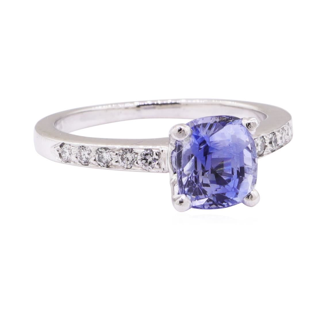 One ring featuring: platinum weighing 5.0 grams containing one cushion cut light blue sapphire weighing 1.76 ct and diamonds weighing 0.30ctw. The ring has a straight line cathedral motif.