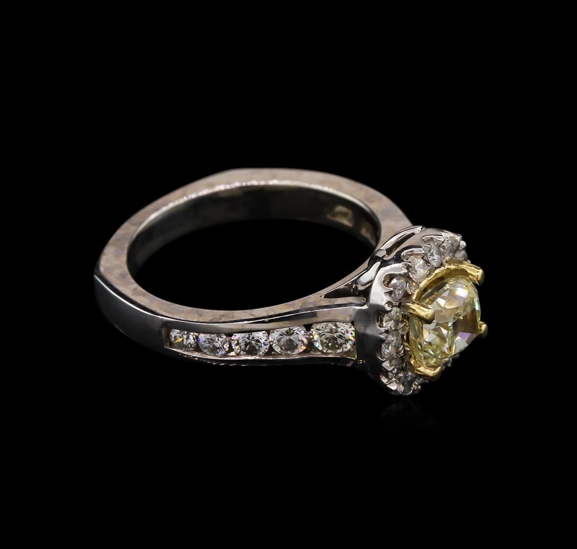 One electronically tested 14KT white gold ladies cast diamond ring with a bright polish finish. The featured diamond is set within an inner yellow gold basket and an outer diamond bezel supported by tapering diamond set shoulders, completed by a two and one-half millimeter wide band. Identified with markings of "14K". Condition is new, good workmanship. Containing: One cushion cut diamond, measuring 5.62 x 4.90 x 3.60mm, 13.00.%. GTCF exact weight 1.17ct. Graded in the setting. Clarity: VVS-2. Depth: 73.5%. Table 69.4%. Twenty-Four prong & channel set round brilliant cut diamonds, measuring 2.90 - 1.60 x 1.35mm exact total weight 24 Stones = 0.90 ct. Graded in the setting. Clarity: SI-2 to I-1. Color: G - I. Total Weight of Diamonds 2.07ct. Total Weight of Ring 6.38gm. AIG Appraised.