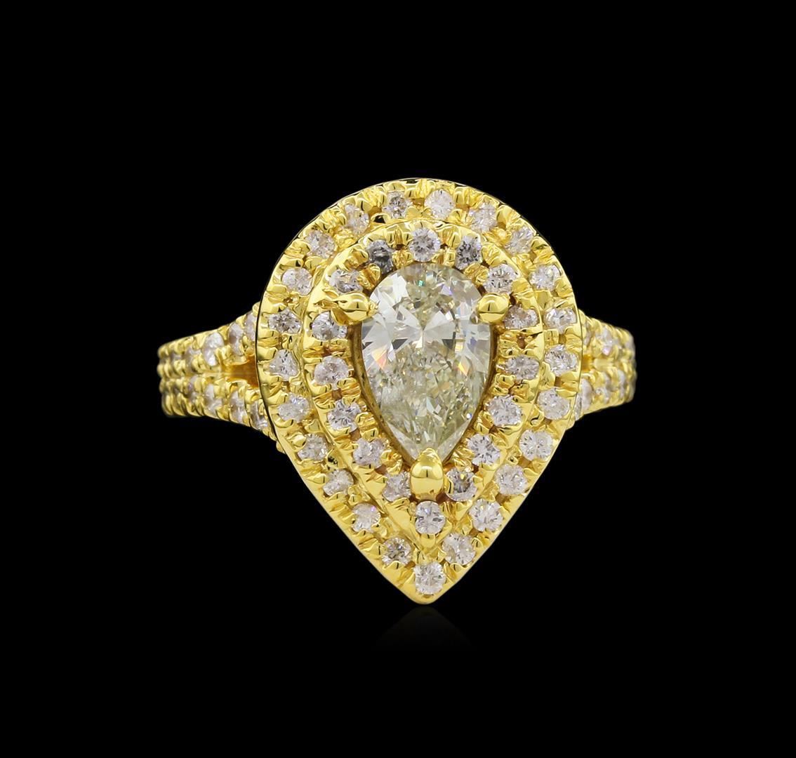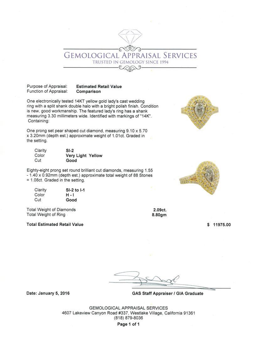 One electronically tested 14KT yellow gold lady's cast wedding ring with a split shank double halo with a bright polish finish. The featured lady's ring has a shank measuring 3.30 millimeters wide. Identified with markings of "14K". Condition is new, good workmanship. Containing: One prong set pear shaped cut diamond, measuring 9.10 x 5.70 x 3.20mm (depth est.) approximate weight of 1.01ct. Graded in the setting. Clarity: SI-2 Cut Good Eighty-Eight prong set round brilliant cut diamonds, measuring 1.55 - 1.40 x 0.92mm (depth est.) approximate total weight of 88 Stones = 1.08ct. Graded in the setting. Clarity: SI-2 to I-1. Color: H - I. Cut Good. Total Weight of Diamonds 2.09ct. Total Weight of Ring 8.80gm. GAS Appraised.