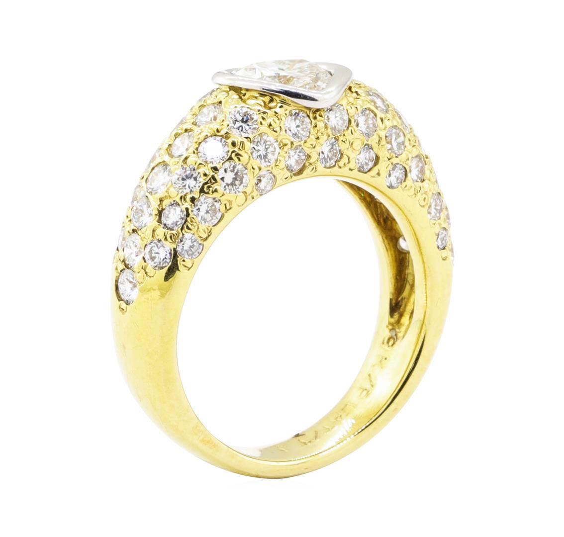 One electronically tested 18KT-platinum yellow gold lady's combination cast & assembled fashion ring with a half dome cluster with a bright polish finish. The featured lady's ring has a heart shaped motif and a shank measuring 3.65 millimeters wide. Identified with markings of '18KT / PLAT'. Condition is Good. Containing: One bezel set heart shaped cut diamond, measuring 6.50 x 5.90 x 3.50mm (depth est.) approximate weight of 0.80ct. Graded in the setting. Color G - H Clarity SI-2 Cut Very Good Sixty-Eight bead set round brilliant cut diamonds, measuring 2.00 - 1.50 x 1.09mm (depth est.) approximate total weight of 68 Stones = 1.30ct. Graded in the setting. Color F - G Clarity VS-1 to VS-2 Cut Very Good. Total Weight of Diamonds 2.10ct.. Total Weight of Ring 7.60gm GAS Appraised at $10715.00. GAS Appraised.
