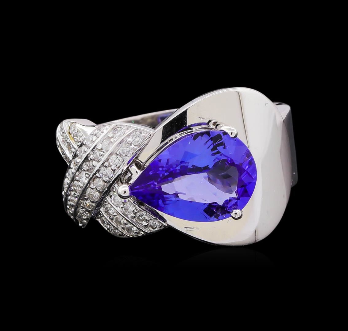 One electronically tested 14KT white gold lady's cast fashion ring with a bright polish finish. The featured lady's ring has a shank measuring 4.62 millimeters in width. Identified with markings of "K14". Condition is new, good workmanship. Containing: Forty-Five prong set round brilliant cut diamonds, measuring 1.20 - 1.15 x 0.72mm (depth est.) approximate total weight of 45 Stones = 0.28ct. Graded in the setting. Clarity: SI-1 to I-1. Color: H - I. Cut Good One prong set pear brilliant cut natural tanzanite, measuring 11.20 x 7.74 x 4.11mm, (depth est.) approximate weight of 2.10 ct., clarity is eye clean, medium, moderately strong, bluish violet color, (GIA bV 5/4), cut is very good. Transmitting light with no distortion, transparent. Colored gemstones are presumed to have been subjected to commonly used enhancement processes. Graded in the setting. Total Weight of Colored Stones 2.10 ct. Total Weight of Diamonds 0.28ct. Total Weight of Ring 6.80gm. GAS Appraised.