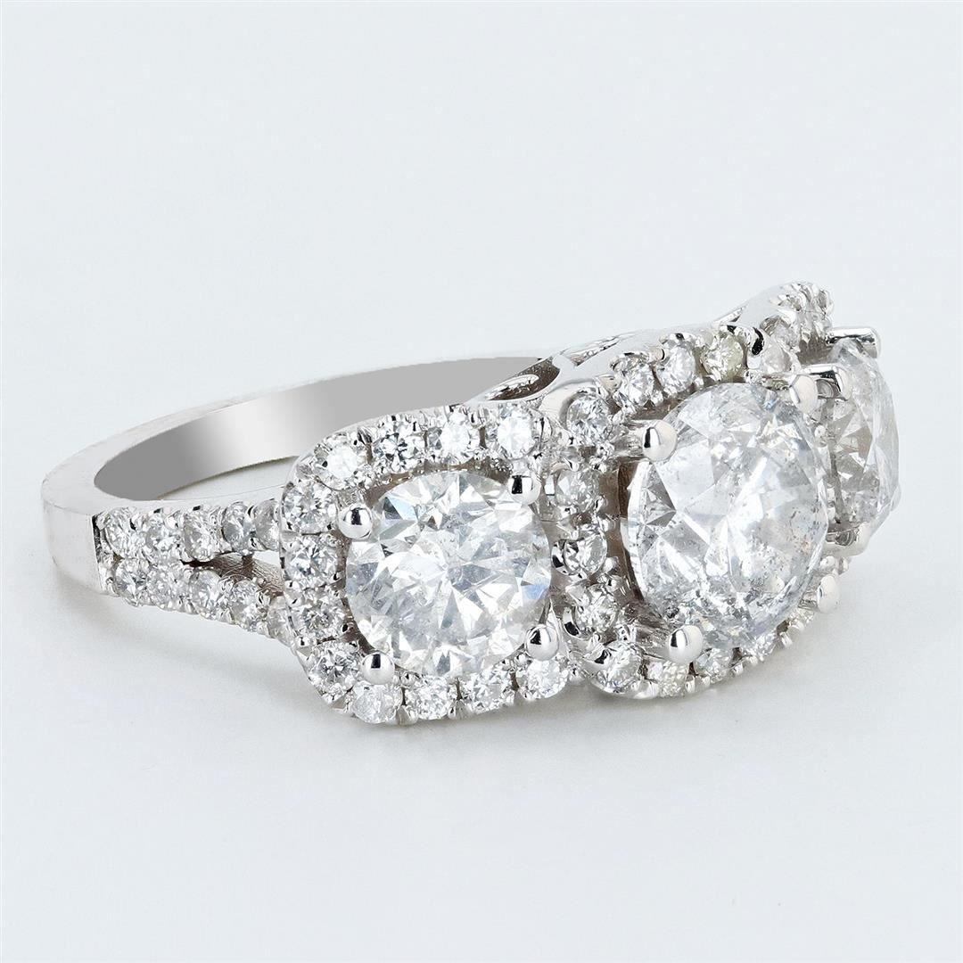 Eighteen karat (18K) white gold round brilliant cut diamond ring. A round brilliant cut diamond is mounted in the center of the ring. Round brilliant cut diamonds accent the ring around and on both sides of the center diamond. The ring has a gross weight