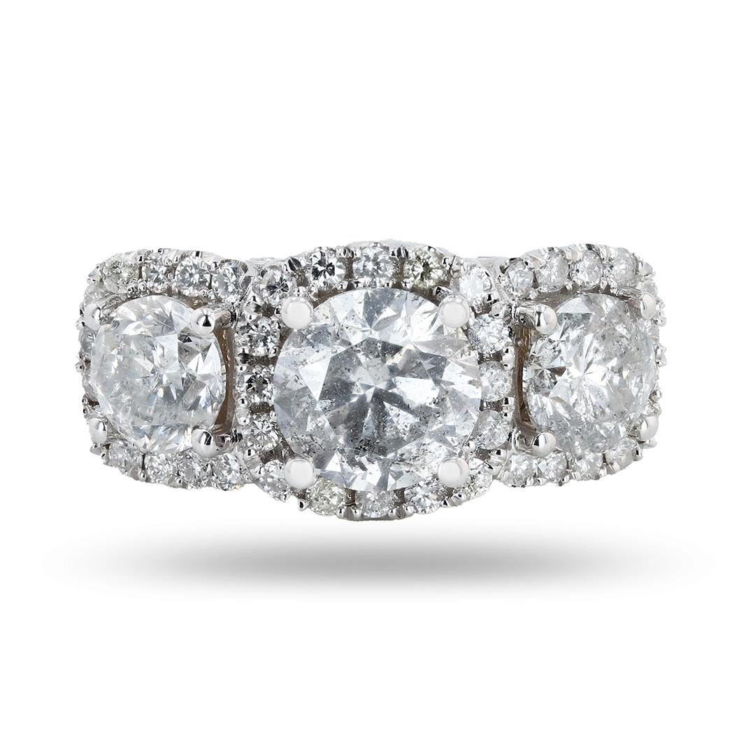 Eighteen karat (18K) white gold round brilliant cut diamond ring. A round brilliant cut diamond is mounted in the center of the ring. Round brilliant cut diamonds accent the ring around and on both sides of the center diamond. The ring has a gross weight