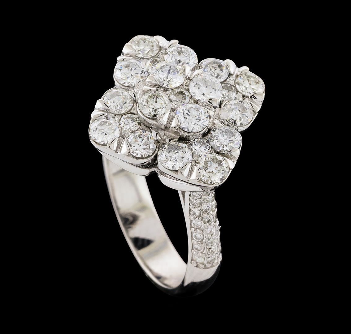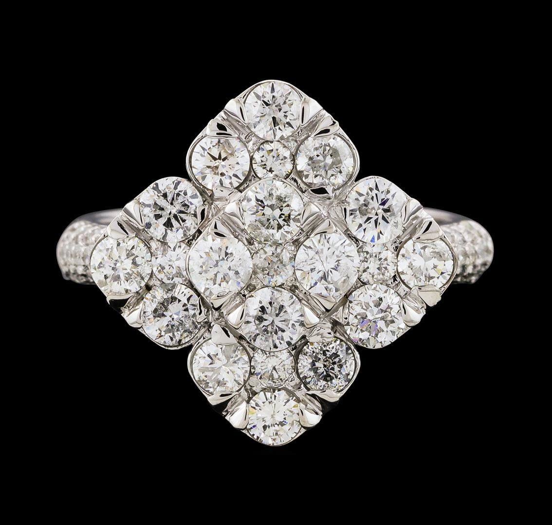 One electronically tested 14KT white gold lady's cast fashion ring with a square basket halo with a bright polish finish. The featured lady's ring has a shank measuring 3.85 millimeters wide. Identified with markings of 'K14'. Condition is new, good workmanship. Containing: Sixteen prong set round brilliant cut diamonds, measuring 3.10 - 3.00 x 1.83mm (depth est.) approximate total weight of 16 Stones = 1.65ct. Graded in the setting. Clarity SI-2 to I-1. Color: G - H Cut Good Five prong set round brilliant cut diamonds, measuring 2.40 - 2.30 x 1.46mm (depth est.) approximate total weight of 5 Stones = 0.25ct. Graded in the setting. Clarity SI-1 to I-1. Color: G - H Cut Good Forty-Four prong set round brilliant cut diamonds, measuring 1.15 - 1.05 x 0.68mm (depth est.) approximate total weight of 44 Stones = 0.22ct. Graded in the setting. Clarity SI-1 to I-1. Color: G - H Cut Good. Total Weight of Diamonds 2.12ct.. Total Weight of Ring 6.80gm. GAS Appraised.