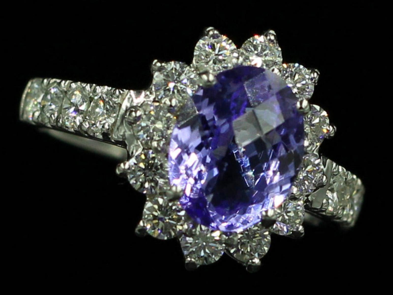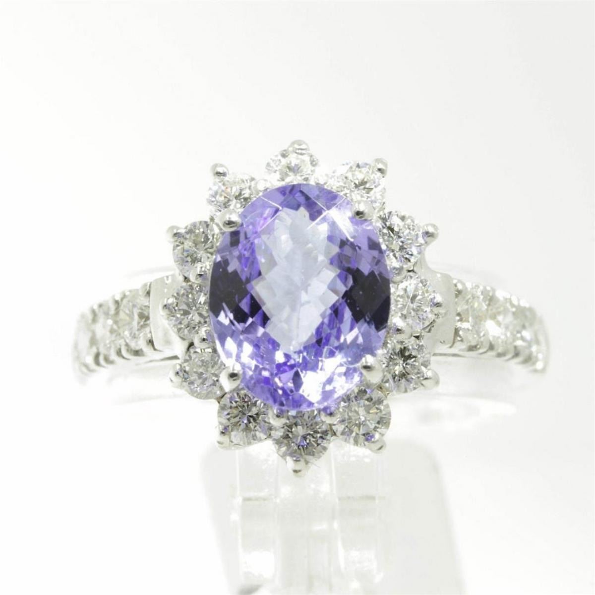 One ring featuring: 14KT white gold weighing 4.16 grams containing one tanzanite weighing 2.12ct and 24 diamonds weighing 1.14ctw. The tanzanite is oval shape with fine clarity and medium blue color with very good cut. The diamonds are round brilliant cut and are natural, unenhanced stones with SI-1 clarity, G-H color and very good cut. The ring is a size 6.5 but is resizable.