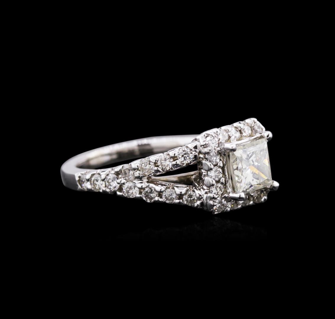 One electronically tested 14KT white gold ladies cast diamond engagement ring with a bright polish finish. Identified with markings of "14K". Condition is new. Containing: One prong set princess cut diamond, measuring 5.50 x 5.50 x 4.13mm (depth est.) approximate weight of 1.03ct. Clarity: I-1. Color: K, Cut is Good. Forty-Eight prong set round brilliant cut diamonds, measuring 2.00 - 2.00 x 1.20mm (depth est.) approximate total weight of 48 Stones = 1.10 ct. Clarity: I-1 to I-2. Color: J, Cut is Good. Diamonds are graded in the mounting, unless otherwise stated. Total Weight of Diamonds 2.13ct. Total Weight of Engagement Ring 6.50 grams. GGL Appraised.