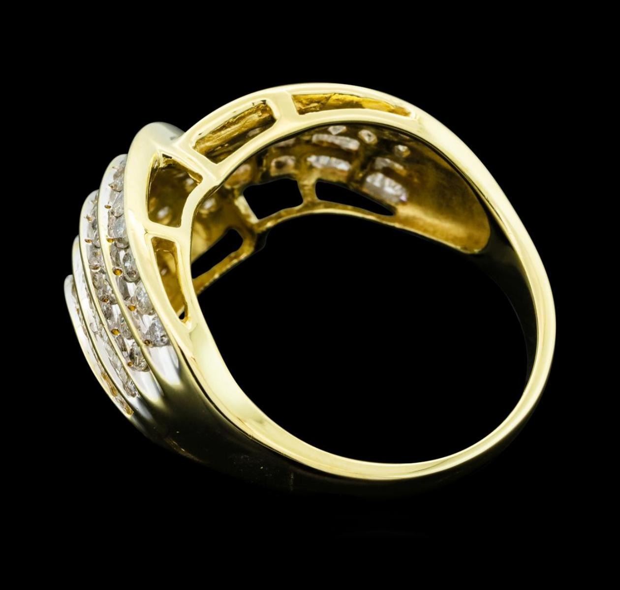 One electronically tested 10KT yellow gold lady's cast fashion ring with a chevron motif shank with a bright polish ?nish. Condition is new, good workmanship. The featured lady's ring has a shankmeasuring 2.28 millimeters wide. Identified with markings of "10K" Containing: Thirty-six prong set round brilliant cut diamonds, measuring 2.10 - 1.70 x 1i18mm (depth est.) approximate total weight of 36 Stones = 0.94ct. Graded in the setting. Clarity I-1 to I-2 Color H - I Cut Good Eighty-seven channel set baguette cut diamonds, measuring from 1.40 X 1.00 x 0.86mm (depth est.) to 1.90 X 1.20 x 1.02mm (depth est.) approximate total weight of 87 Stones = 1.20ct. Graded in the setting. Clarity SI-1 to I-1 Color H - I Cut Good Total Weight of Diamonds 2.14ct. Total Weight of Ring 6.80gm Total Estimated Retail Value S 4140.00 GAS Appraised.