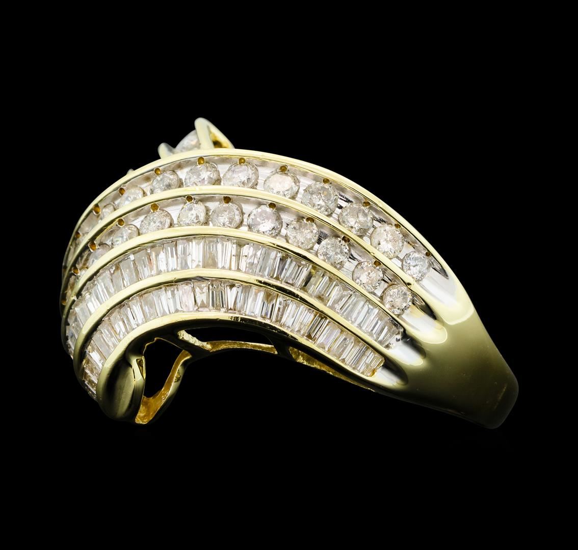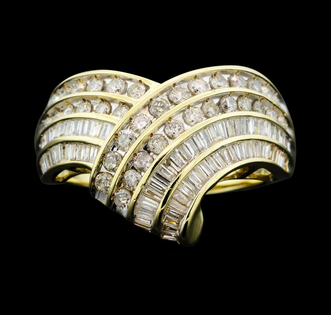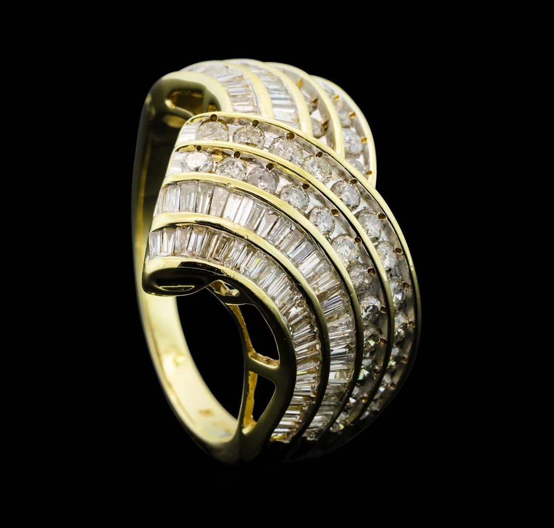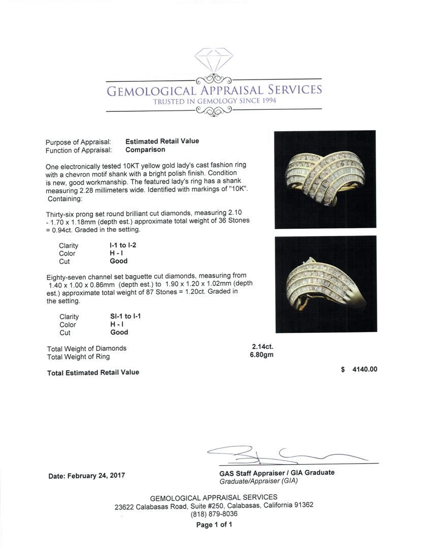 One electronically tested 10KT yellow gold lady's cast fashion ring with a chevron motif shank with a bright polish ?nish. Condition is new, good workmanship. The featured lady's ring has a shankmeasuring 2.28 millimeters wide. Identified with markings of "10K" Containing: Thirty-six prong set round brilliant cut diamonds, measuring 2.10 - 1.70 x 1i18mm (depth est.) approximate total weight of 36 Stones = 0.94ct. Graded in the setting. Clarity I-1 to I-2 Color H - I Cut Good Eighty-seven channel set baguette cut diamonds, measuring from 1.40 X 1.00 x 0.86mm (depth est.) to 1.90 X 1.20 x 1.02mm (depth est.) approximate total weight of 87 Stones = 1.20ct. Graded in the setting. Clarity SI-1 to I-1 Color H - I Cut Good Total Weight of Diamonds 2.14ct. Total Weight of Ring 6.80gm Total Estimated Retail Value S 4140.00 GAS Appraised.