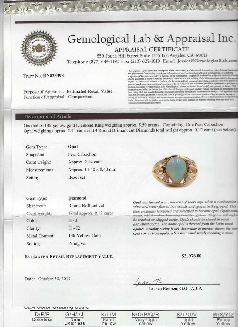 One 2.14ct Opal and Diamond Ring - 14KT Yellow Gold. GLA certified. See Appraisal for more details. GLA Appraised.