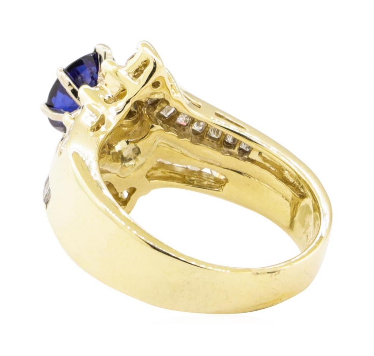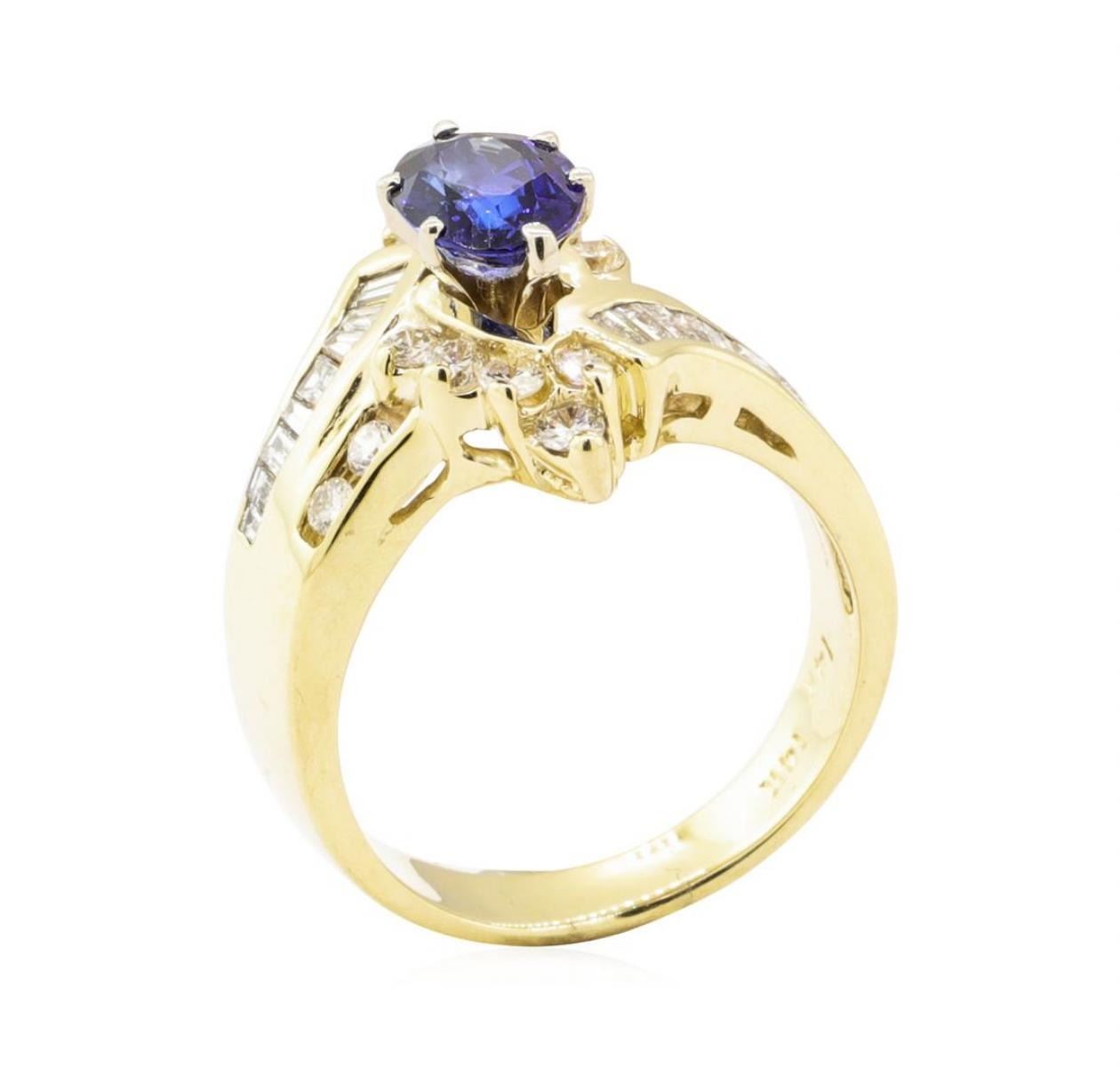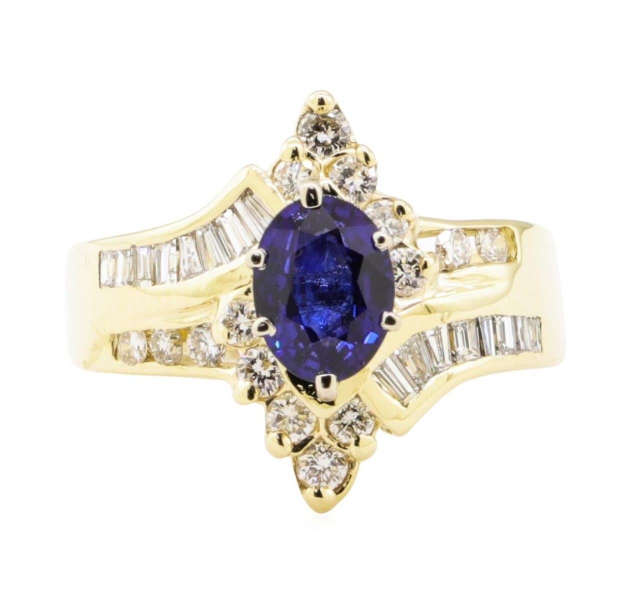 One electronically tested 14KT yellow gold lady's combination cast & assembled fashion ring with a bypass motif with a bright polish finish. The featured lady's ring has a shank measuring 3.80 millimeters wide. Identified with markings of '14K'. Condition is like new, good workmanship. Containing: One prong set oval modified mixed cut natural blue sapphire, measuring 7.60 x 5.75 x 3.30mm, (depth est.) approximate weight of 1.20ct., clarity is slightly included, medium dark, moderately strong, blue color, (GIA B 6/4), cut is good. Transmitting light with a minimum of distortion, transparent. Colored gemstones are presumed to have been subjected to commonly used enhancement processes. Graded in the setting. Sixteen channel set baguette cut (tapered) diamonds, measuring from 1.60 x 1.20 x 1.02mm (depth est.) to 2.30 x 1.60 x 1.36mm (depth est.) approximate total weight of 16 Stones = 0.48ct. Graded in the setting. Color H - I Clarity VS-1 to VS-2 Cut Very Good Fourteen channel and prong set round brilliant cut diamonds, measuring 2.20 - 1.90 x 1.27mm (depth est.) approximate total weight of 14 Stones = 0.47ct. Graded in the setting. Color H - I Clarity VS-2 to SI-1 Cut Very Good. Total Weight of Colored Stones 1.20ct.. Total Weight of Diamonds 0.95ct.. Total Weight of Ring 8.50gm GAS Appraised at $5175.00. GAS Appraised.