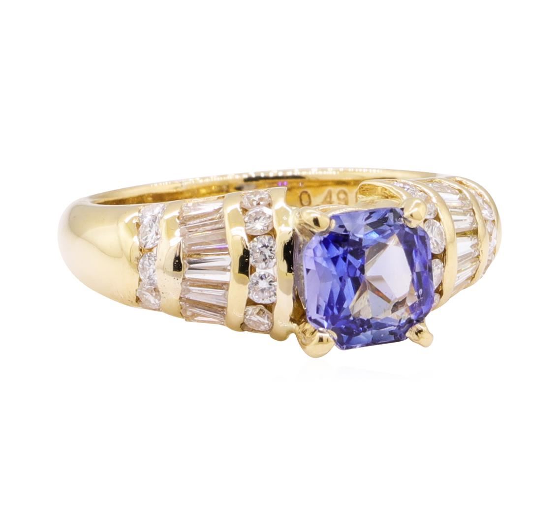 One electronically tested 18KT yellow gold lady's cast fashion ring with a tapered domed shank with a bright polish finish. The featured lady's ring has a shank measuring 2.70 millimeters wide. Identified with markings of '18K'. Condition is like new, good workmanship. Containing: One prong set radiant modified brilliant cut natural blue sapphire, measuring 6.52 x 6.36 x 2.77mm, (depth est.) 5%. bulge factor, approximate weight of 1.33ct., clarity is eye clean, medium light, moderately strong, violetish blue color, (GIA vB 4/4), cut is very good. Transmitting light with no distortion, transparent. Colored gemstones are presumed to have been subjected to commonly used enhancement processes. Graded in the setting. Fourteen channel set baguette cut (tapered) diamonds, measuring from 2.25 x 1.30 x 1.11mm (depth est.) to 2.70 x 1.50 x 1.28mm (depth est.) approximate total weight of 14 Stones = 0.52ct. Graded in the setting. Color H - I Clarity VS-2 to SI-1 Cut Very Good Twenty-Two channel set round brilliant cut diamonds, measuring 1.60 - 1.50 x 0.96mm (depth est.) approximate total weight of 22 Stones = 0.30ct. Graded in the setting. Color G - H Clarity VS-2 to SI-1 Cut Very Good. Total Weight of Colored Stones 1.33ct.. Total Weight of Diamonds 0.82ct.. Total Weight of Ring 6.00gm GAS Appraised at $4995.00. GAS Appraised.