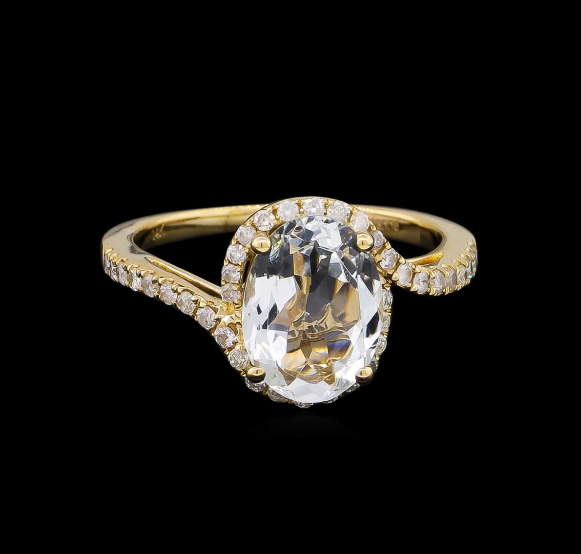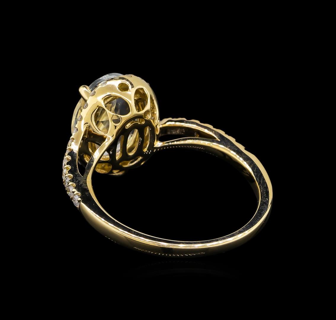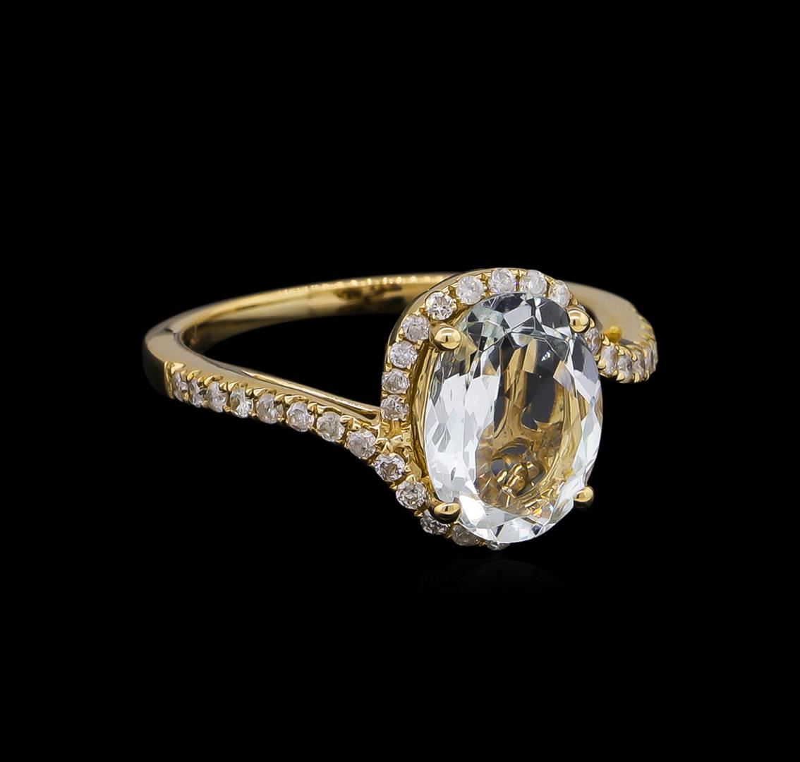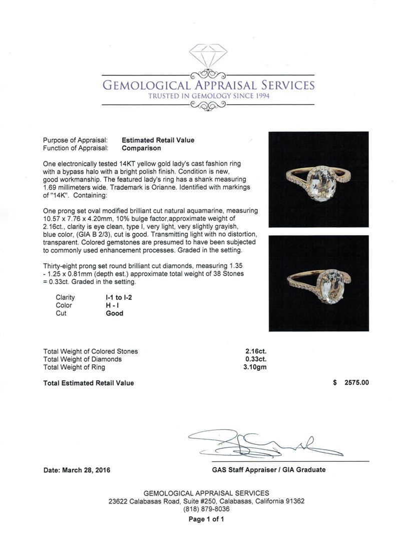 One electronically tested 14KT yellow gold lady's cast fashion ring with a bypass halo with a bright polish finish. The featured lady's ring has a shank measuring 1.69 millimeters wide. Trademark is Orianne. Identified with markings of '14K'. Condition is new, good workmanship. Containing: One prong set oval modified brilliant cut natural aquamarine, measuring 10.57 x 7.76 x 4.20mm, 10%. bulge factor, approximate weight of 2.16ct., clarity is eye clean, type I, very light, very slightly grayish, blue color, (GIA B 2/3), cut is good. Transmitting light with no distortion, transparent. Colored gemstones are presumed to have been subjected to commonly used enhancement processes. Graded in the setting. Thirty-Eight prong set round brilliant cut diamonds, measuring 1.35 - 1.25 x 0.81mm (depth est.) approximate total weight of 38 Stones = 0.33ct. Graded in the setting. Clarity I-1 to I-2. Color: H - I Cut Good. Total Weight of Colored Stones 2.16ct.. Total Weight of Diamonds 0.33ct.. Total Weight of Ring 3.10gm. GAS Appraised at $2,575.00.