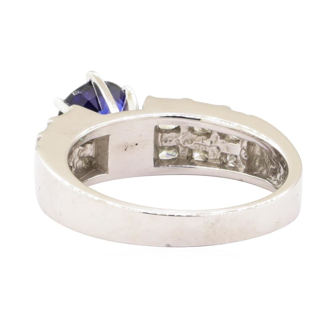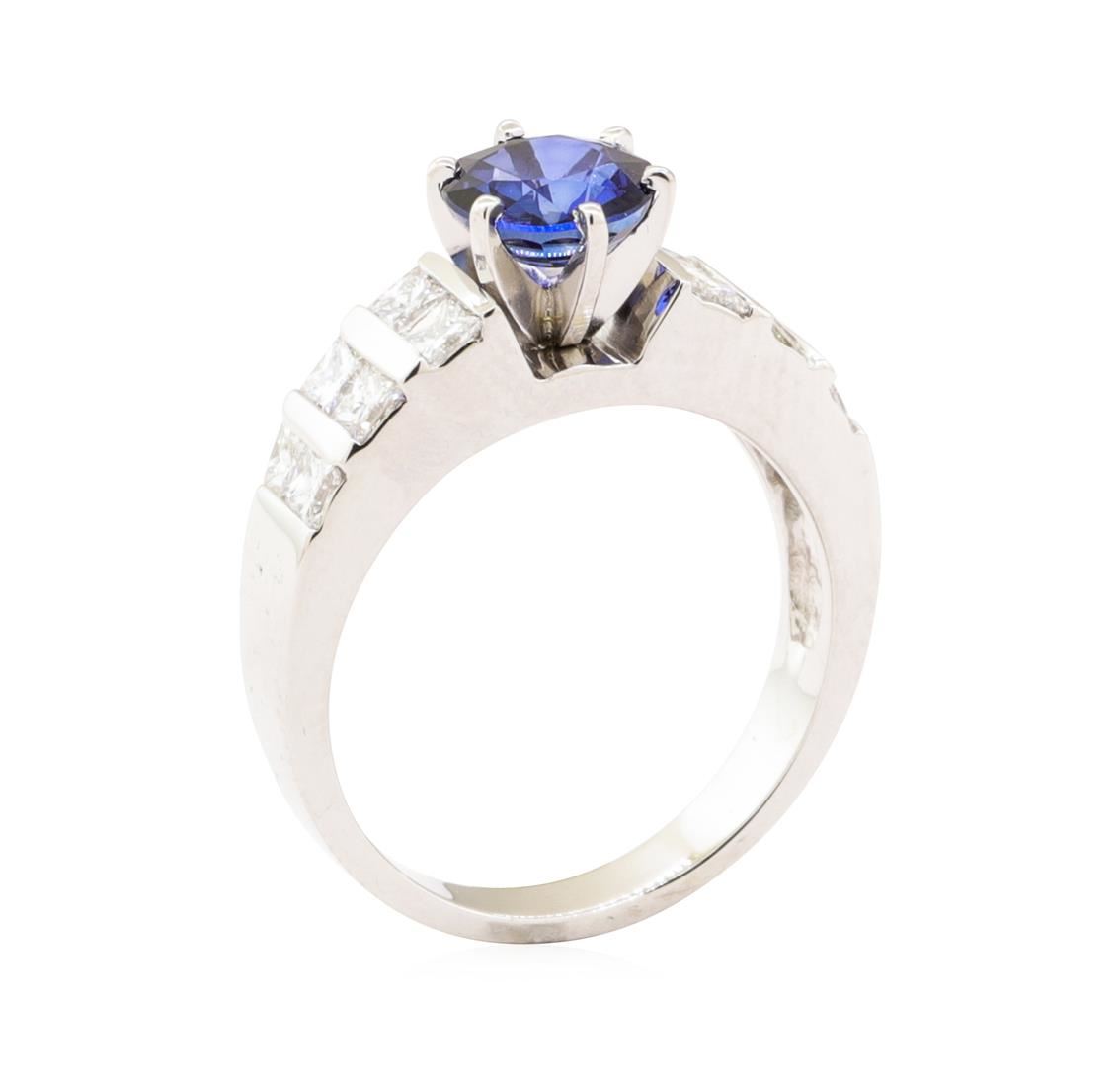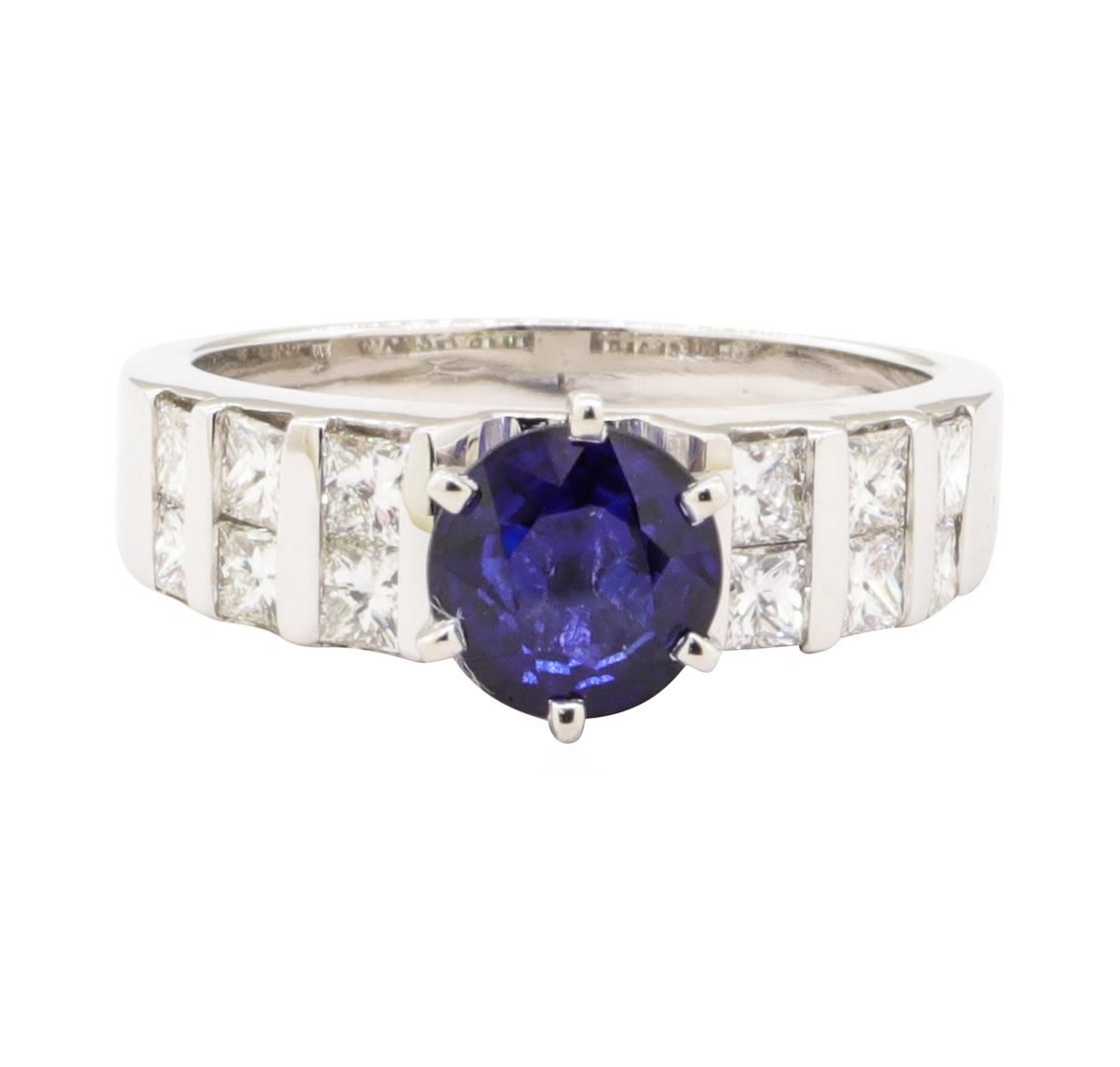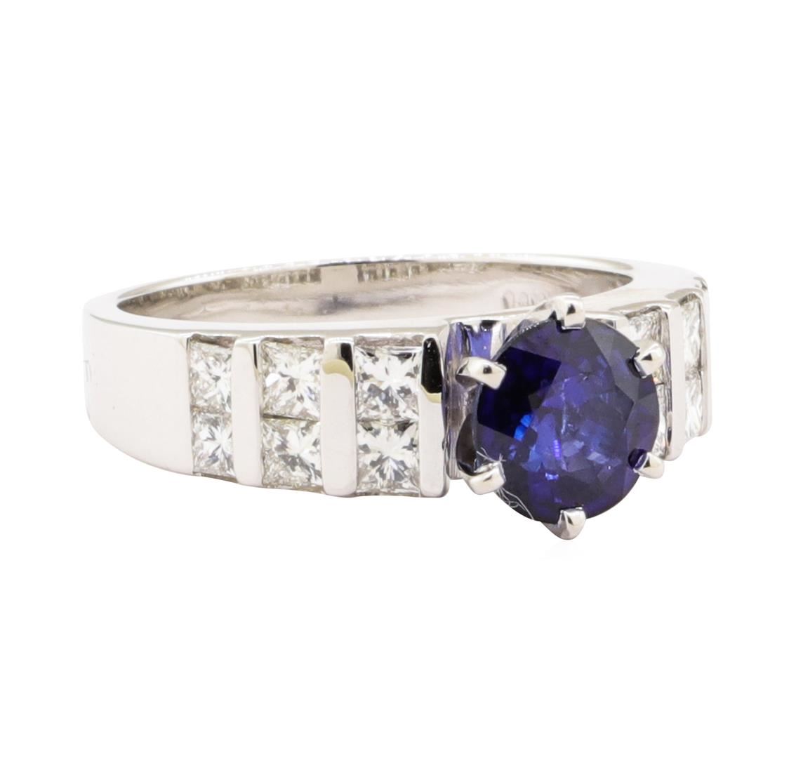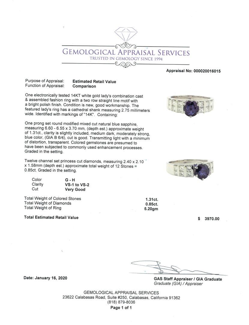 One electronically tested 14KT white gold lady's combination cast & assembled fashion ring with a two row straight line motif with a bright polish finish. The featured lady's ring has a cathedral shank measuring 2.75 millimeters wide. Identified with markings of '14K'. Condition is new, good workmanship. Containing: One prong set round modified mixed cut natural blue sapphire, measuring 6.60 - 6.55 x 3.70 mm, (depth est.) approximate weight of 1.31ct., clarity is slightly included, medium dark, moderately strong, blue color, (GIA B 6/4), cut is good. Transmitting light with a minimum of distortion, transparent. Colored gemstones are presumed to have been subjected to commonly used enhancement processes. Graded in the setting. Twelve channel set princess cut diamonds, measuring 2.40 x 2.10 x 1.58mm (depth est.) approximate total weight of 12 Stones = 0.85ct. Graded in the setting. Color G - H Clarity VS-1 to VS-2 Cut Very Good. Total Weight of Colored Stones 1.31ct.. Total Weight of Diamonds 0.85ct.. Total Weight of Ring 5.20gm GAS Appraised at $3970.00. GAS Appraised.