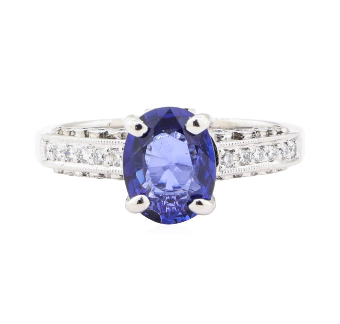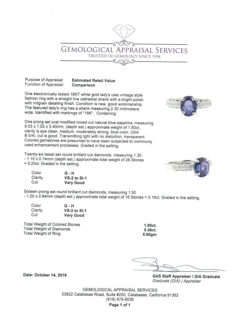 One electronically tested 18KT white gold lady's cast vintage style fashion ring with a straight line cathedral shank with a bright polish with milgrain detailing finish. The featured lady's ring has a shank measuring 2.30 millimeters wide. Identified with markings of '18K'. Condition is new, good workmanship. Containing: One prong set oval modified mixed cut natural blue sapphire, measuring 9.03 x 7.02 x 3.40mm, (depth est.) approximate weight of 1.80ct., clarity is eye clean, medium, moderately strong, blue color, (GIA B 5/4), cut is good. Transmitting light with no distortion, transparent. Colored gemstones are presumed to have been subjected to commonly used enhancement processes. Graded in the setting. Twenty-Six bezel set round brilliant cut diamonds, measuring 1.30 - 1.10 x 0.74mm (depth est.) approximate total weight of 26 Stones = 0.20ct. Graded in the setting. Color G - H Clarity VS-2 to SI-1 Cut Very Good Sixteen prong set round brilliant cut diamonds, measuring 1.50 - 1.20 x 0.84mm (depth est.) approximate total weight of 16 Stones = 0.16ct. Graded in the setting. Color G - H Clarity VS-2 to SI-1 Cut Very Good. Total Weight of Colored Stones 1.80ct.. Total Weight of Diamonds 0.36ct.. Total Weight of Ring 5.80gm GAS Appraised at $5560.00. GAS Appraised.