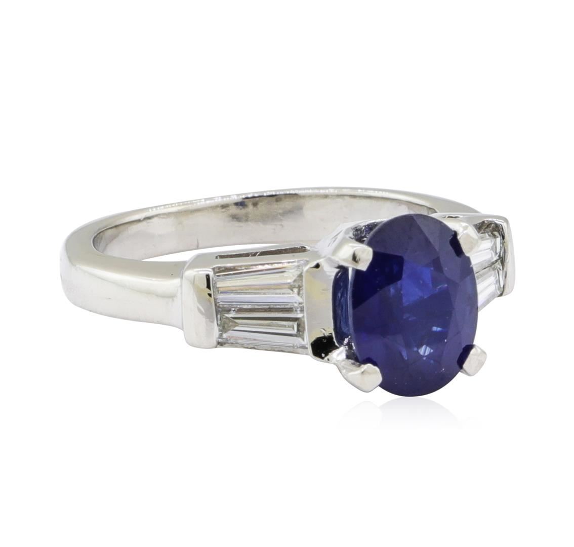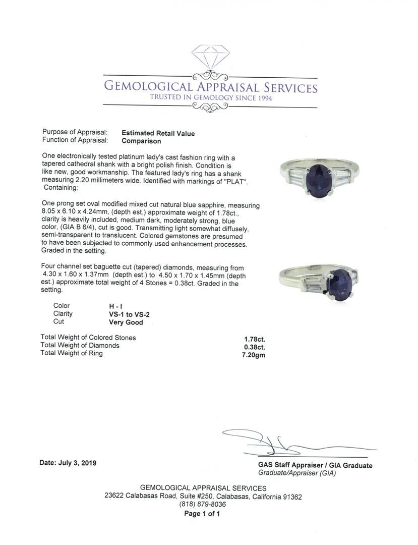 One electronically tested platinum lady's cast fashion ring with a tapered cathedral shank with a bright polish finish. The featured lady's ring has a shank measuring 2.20 millimeters wide. Identified with markings of 'PLAT'. Condition is like new, good workmanship. Containing: One prong set oval modified mixed cut natural blue sapphire, measuring 8.05 x 6.10 x 4.24mm, (depth est.) approximate weight of 1.78ct., clarity is heavily included, medium dark, moderately strong, blue color, (GIA B 6/4), cut is good. Transmitting light somewhat diffusely, semi-transparent to translucent. Colored gemstones are presumed to have been subjected to commonly used enhancement processes. Graded in the setting. Four channel set baguette cut (tapered) diamonds, measuring from 4.30 x 1.60 x 1.37mm (depth est.) to 4.50 x 1.70 x 1.45mm (depth est.) approximate total weight of 4 Stones = 0.38ct. Graded in the setting. Color H - I Clarity VS-1 to VS-2 Cut Very Good. Total Weight of Colored Stones 1.78ct.. Total Weight of Diamonds 0.38ct.. Total Weight of Ring 7.20gm GAS Appraised at $4260.00. GAS Appraised.