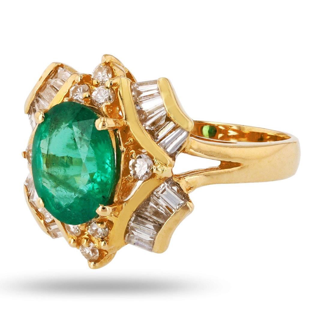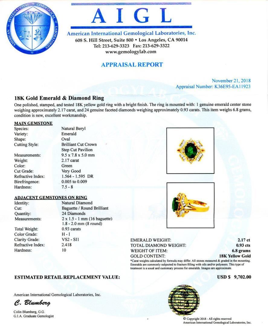 One polished, stamped, and tested 18K yellow gold ring with a bright finish. The ring is mounted with: 1 genuine emerald center stone weighing approximately 2.17 carat, and 24 genuine faceted diamonds weighing approximately 0.93 carats. This item weighs 6.8 grams, condition is new, excellent workmanship. MAIN GEMSTONE Species: Natural Beryl Variety: Emerald Shape: Oval Cutting Style: Brilliant Cut Crown Step Cut Pavilion Measurements: 9.5mm x 7.8mm x 5.0mm Weight: 2.17 carat Color: Green Cut Grade: Very Good Refractive Index: 1.564 - 1.595 DR Birefringence: 0.005 to 0.009 Hardness: 7.5 - 8 ADJACENT GEMSTONES ON RING Identity: Natural Diamond Cut: Baguette / Round Brilliant Quantity: 24 Diamonds Measurements: 2mm x 1.5mm to 1mm (16 baguette) 1.8mm to 2.0mm (8 round) Total Weight: 0.93 carats Color Grade: H - I Clarity Grade: VS2 to SI1 Refractive Index: 2.418 Hardness: 10 EMERALD WEIGHT: 2.17 ct TOTAL DIAMOND WEIGHT: 0.93 cts WEIGHT OF ITEM: 6.8 grams GOLD CONTENT: 18K Yellow Gold