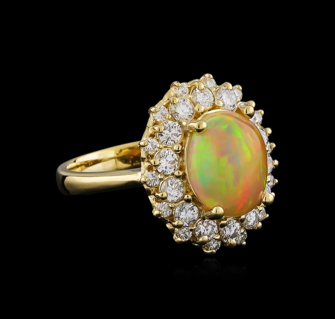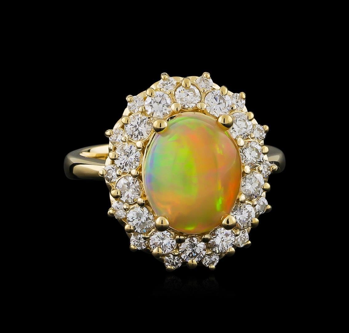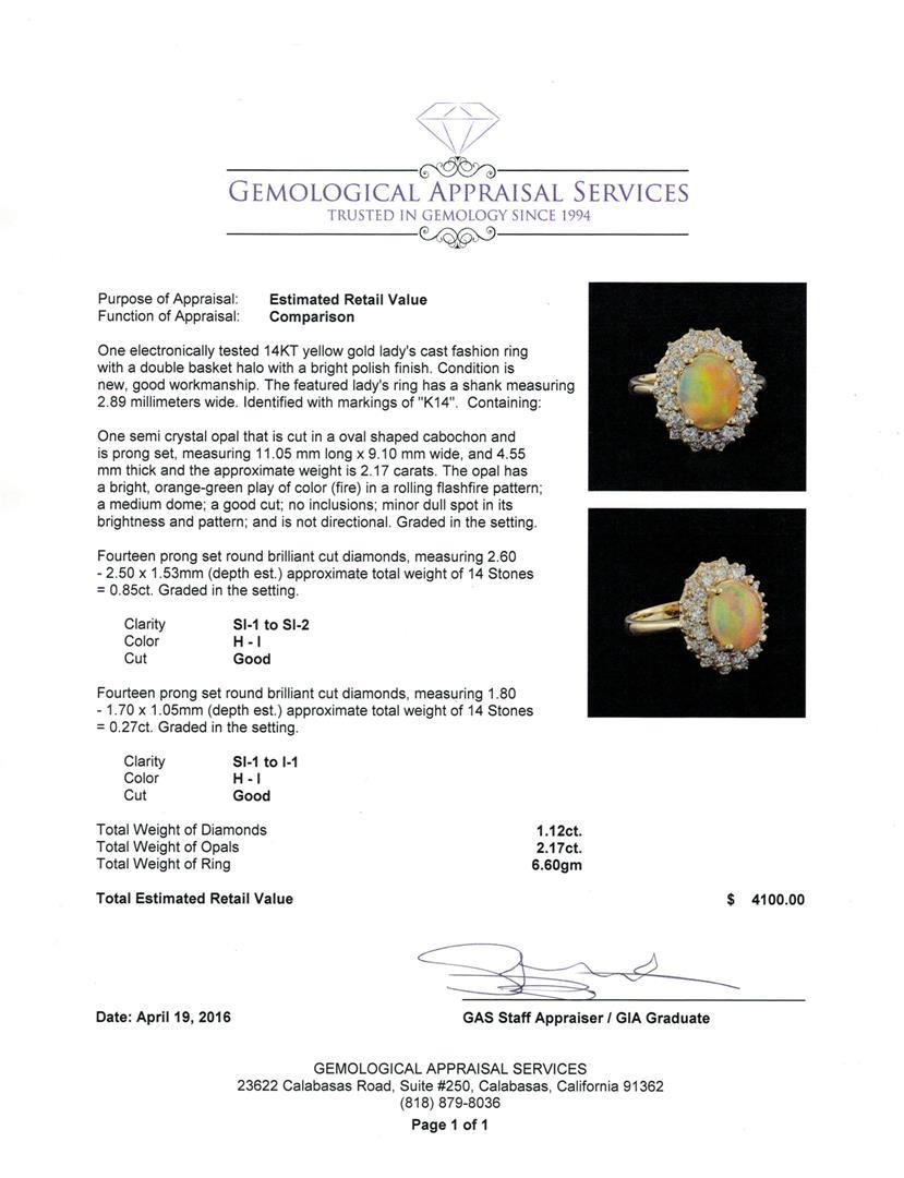 One electronically tested 14KT yellow gold lady's cast fashion ring with a double basket halo with a bright polish finish. The featured lady's ring has a shank measuring 2.89 millimeters wide. Identified with markings of "K14". Condition is new, good workmanship. Containing: One semi crystal opal that is cut in a oval shaped cabochon and is prong set, measuring 11.05 mm long x 9.10 mm wide, and 4.55 mm thick and the approximate weight is 2.17 carats. The opal has a bright, orange-green play of color (fire) in a rolling flashfire pattern; a medium dome; a good cut; no inclusions; minor dull spot in its brightness and pattern; and is not directional. Graded in the setting. Fourteen prong set round brilliant cut diamonds, measuring 2.60 - 2.50 x 1.53mm (depth est.) approximate total weight of 14 Stones = 0.85ct. Graded in the setting. Clarity: SI-1 to SI-2. Color: H - I. Cut Good Fourteen prong set round brilliant cut diamonds, measuring 1.80 - 1.70 x 1.05mm (depth est.) approximate total weight of 14 Stones = 0.27ct. Graded in the setting. Clarity: SI-1 to I-1. Color: H - I. Cut Good. Total Weight of Diamonds 1.12ct. Total Weight of Opals 2.17ct. Total Weight of Ring 6.60gm. GAS Appraised.